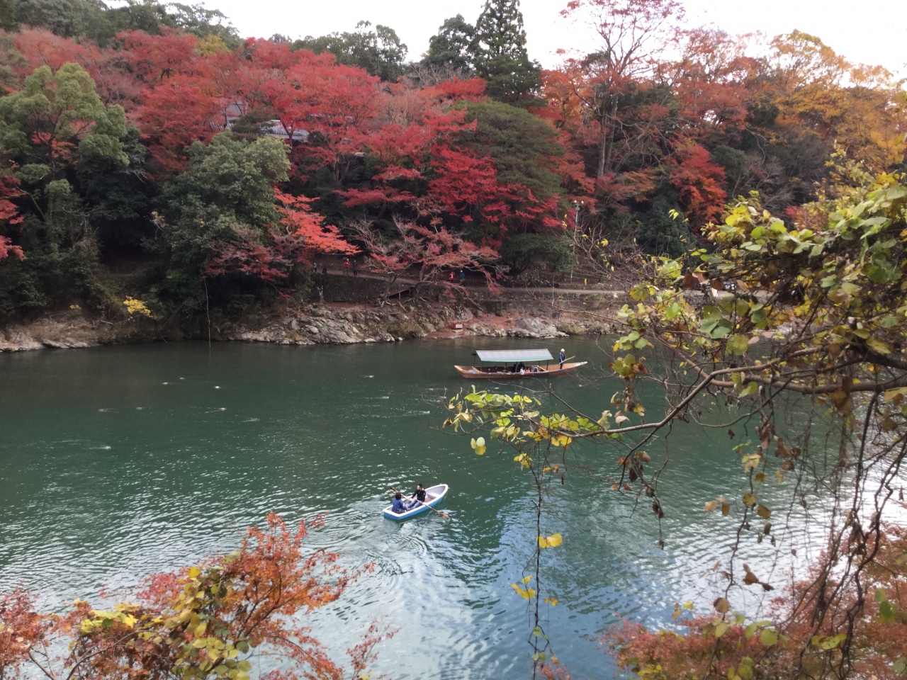 11月後半の平日の朝に少しは人の混雑がマシかと思った行きましたが、渡月橋の辺りは人が多く混雑してました。橋を渡って北側の川ぞいの道をずっと歩いていくと、北嵐山の素晴らしい景色に会えます。人もまばらで、渓谷の紅葉をゆったりと思い存分観賞出来ます。川の流れも穏やかで、川の色が青く澄んでいました。少し前までいた渡月橋の喧噪が嘘のような、静かな奥嵐山の時を忘れる世界が広がっています。