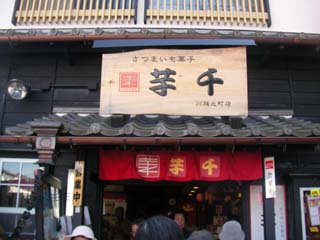 本川越駅から蔵の街のある通りを進んだ街の中心の辻の先の菓子屋横丁の近くに芋千川越店があり、川越名物の芋けんぴなど芋菓子を売っています。大学芋を買って隣にある元町休憩所で食べてみると、蜜が多くて美味です。