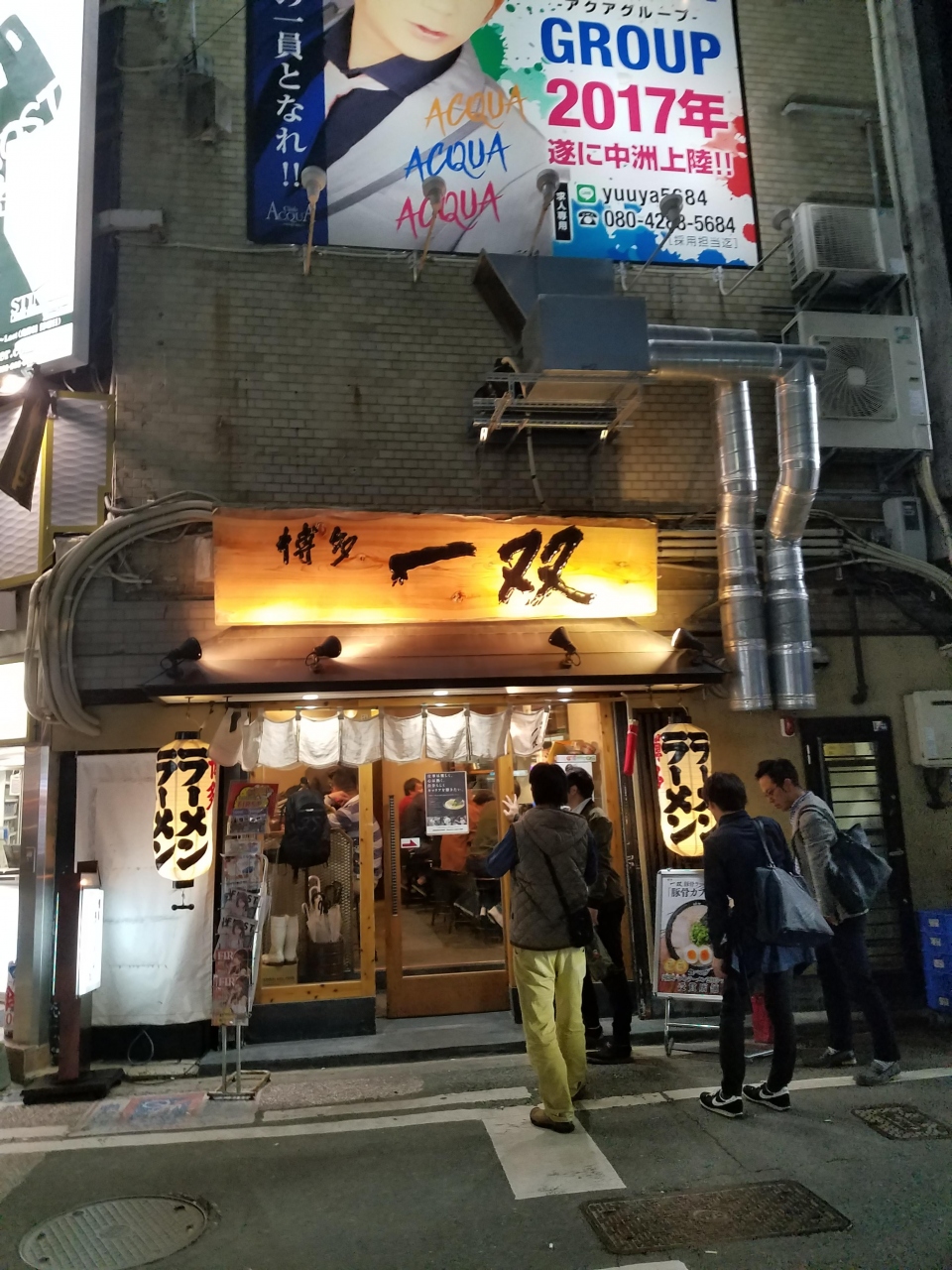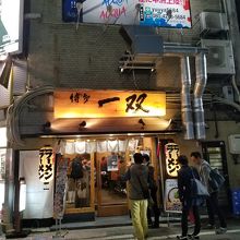 博多一双は、博多豚骨ラーメンの人気店で中洲店は中洲大通り横にあります。飲み会後のかなり遅い時間でしたが行列ができていました。豚骨濃厚スープは脂が泡のように浮かんでいるのが特徴です。かた麺とクリーミーなスープのバランスが良く美味しくいただきました。