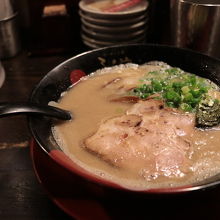 細くて歯ごたえのある麺、濃厚な豚骨味のスープで個人的には満足の一品です。麺の硬さは好みによって変えられます。高菜やニンニクなどが卓上に置いてあるので好きに使えました。店内は広く、テーブル・カウンター席共に多くあるので待ち時間もそこまで長くならないかと思います。替え玉は普通サイズと半分とあるので、ちょっと物足りないときなどに良いと感じました。
