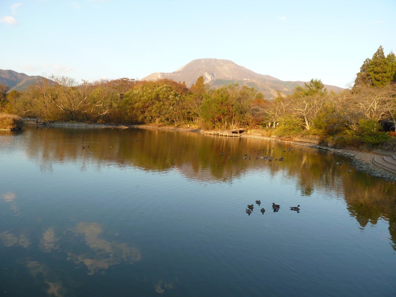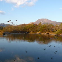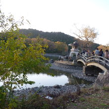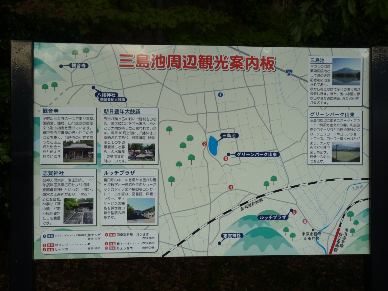 春は桜。秋は紅葉のスポットの一つとなっている。特に秋は伊吹山と紅葉のコントラストがきれいで、池にはカモたちも飛来して楽しませてくれる。池から太鼓橋が突き出て、池で遊ぶ鴨たちと逆さに映る伊吹山をバックに多くの観光客が記念撮影をしている。紅葉もちょうど見ごろで隠れたスポットの一つと言えよう。