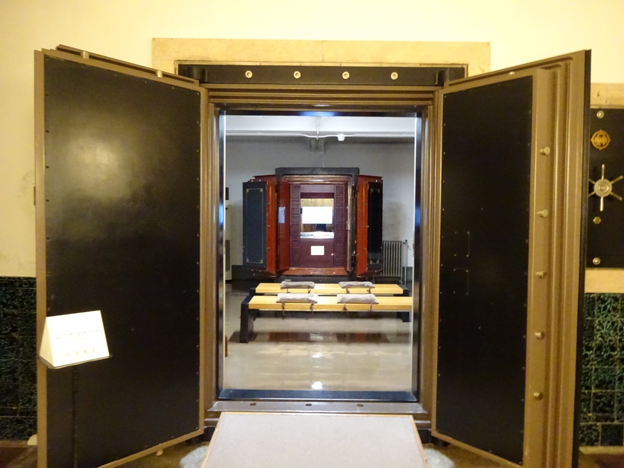 煉瓦と白タイルの瀟洒な外観はさることながら、内部の営業室の大空間や、頭取室・応接室や階段などの豪華な造りなど古き良き時代の銀行の雰囲気を存分に感じることができます。奥の管理棟には「勝平得之記念館」が併設され、当地出身の木版画家の作品も鑑賞可能。