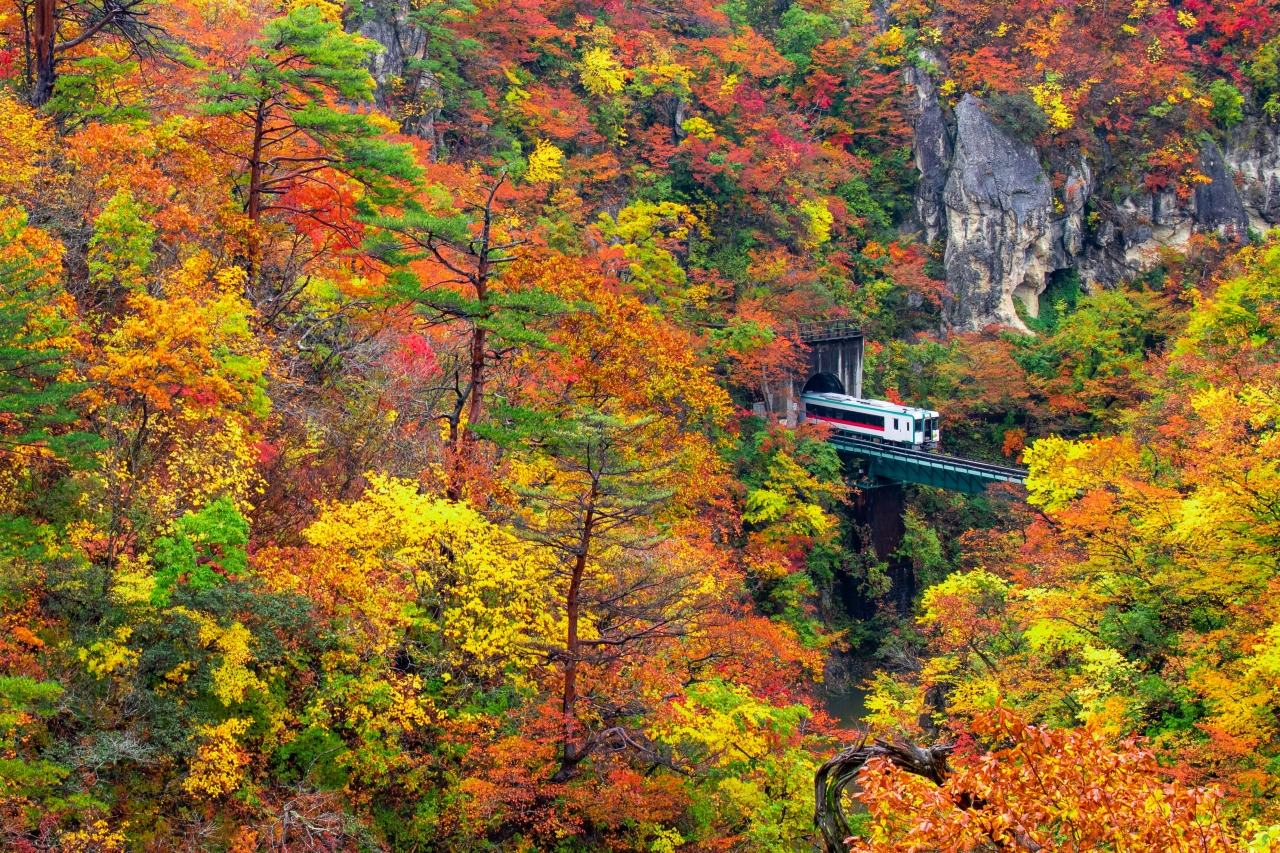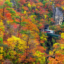 有名な列車撮影なら大深沢橋です。一方、橋を見るならレストハウスからです。紅葉のベストの時期に訪れましたが、とても美しかったです。他の山や渓谷と違い、赤や緑、黄色と色んな鮮やかな色がとても華やかでした。
