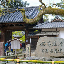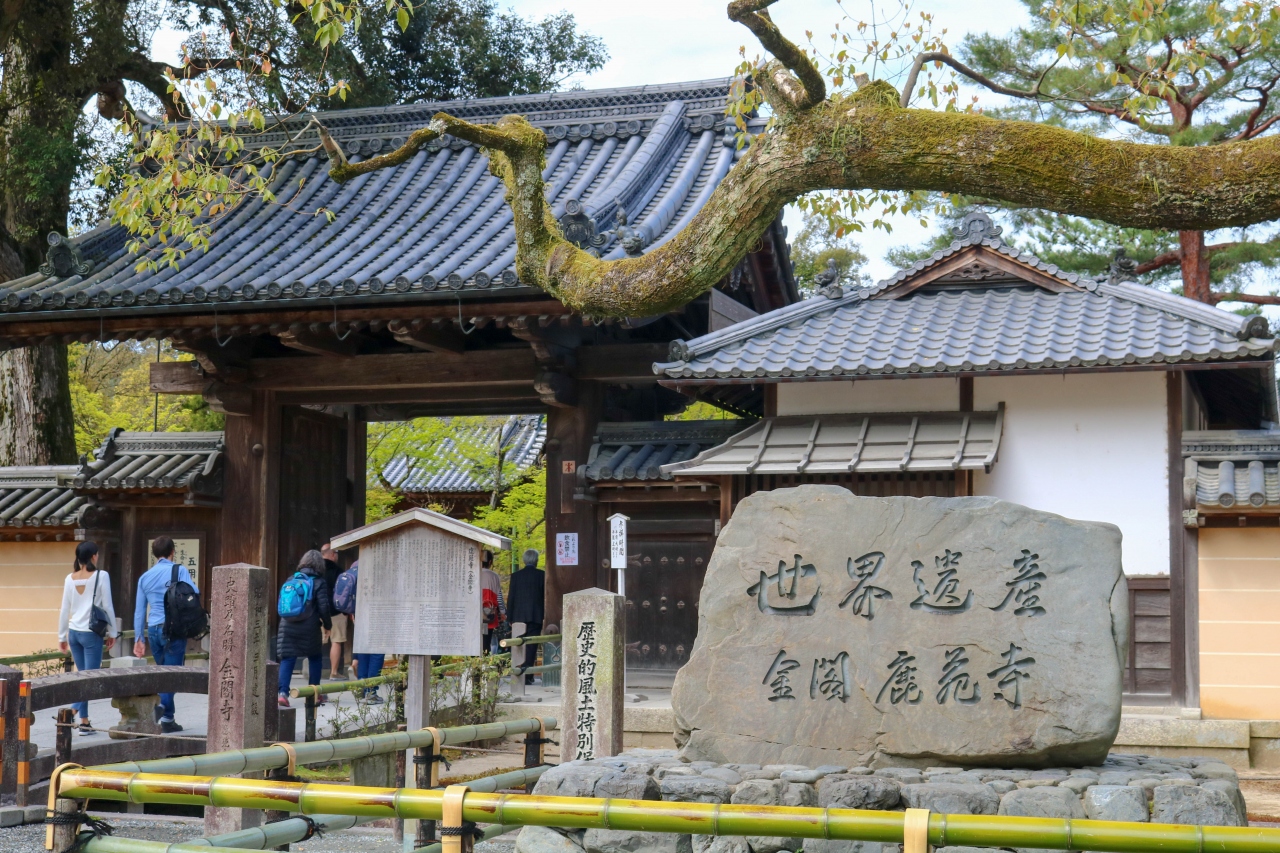 金額寺の入場門で、ここからが入場料の必要なエリアになります。有名な寺院の割に安いのが良いですね。門の手前に立派な石碑があり、まず最初の記念撮影スポットになると思います。門の前にある松もとても立派で絵になります。