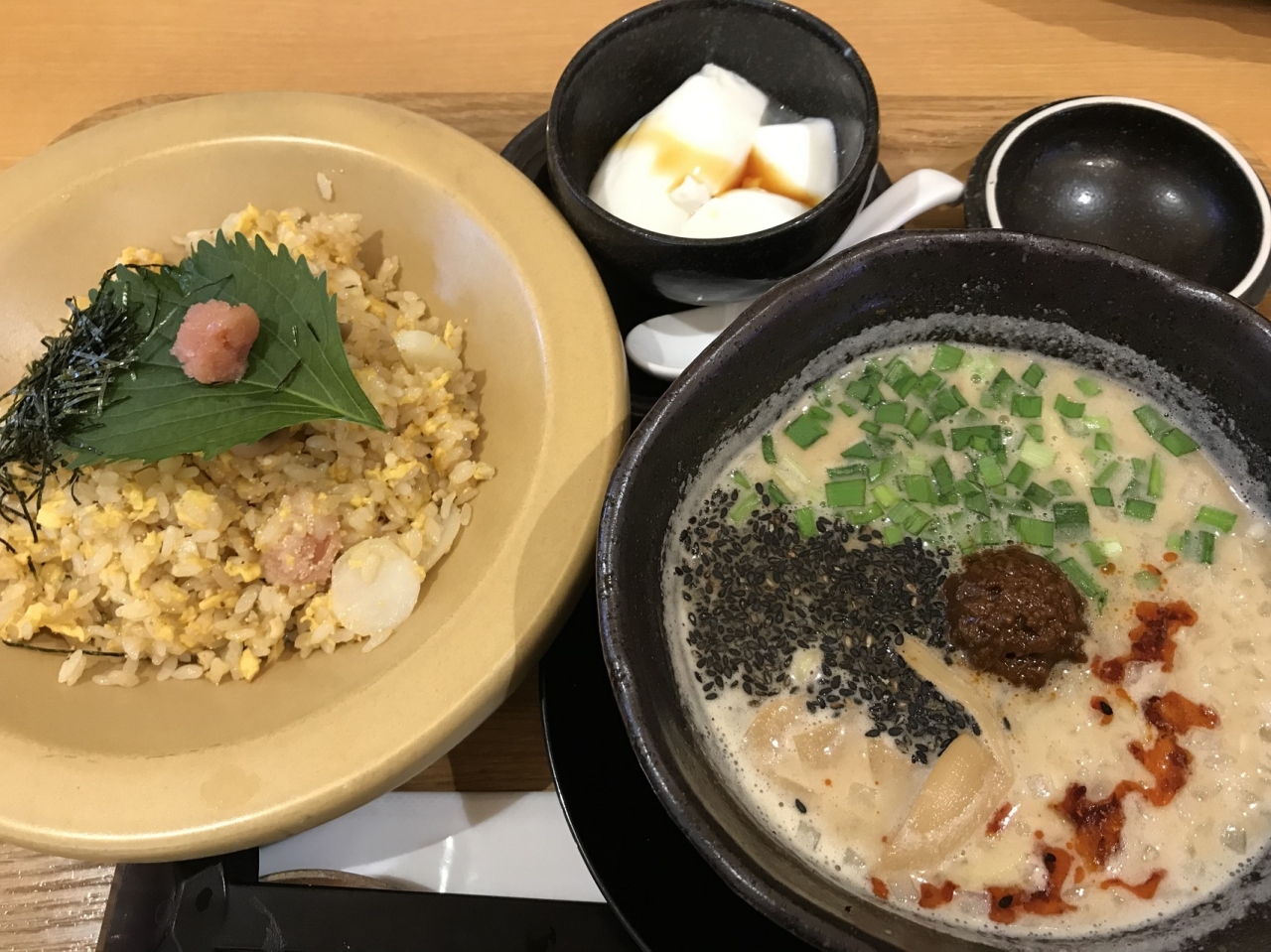 レイクタウンmori3階のフードコート内にあります。タラコとしめじバター炒飯とハーフ担々麺のセットを注文。それと、越谷市のパパ・ママ応援ショップ優待カード提示で杏仁豆腐のサービスを受けられるのですが、それを利用。