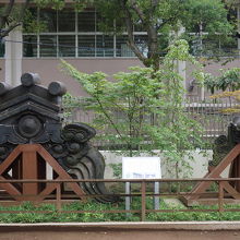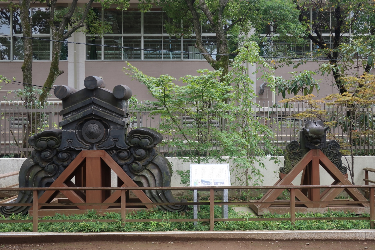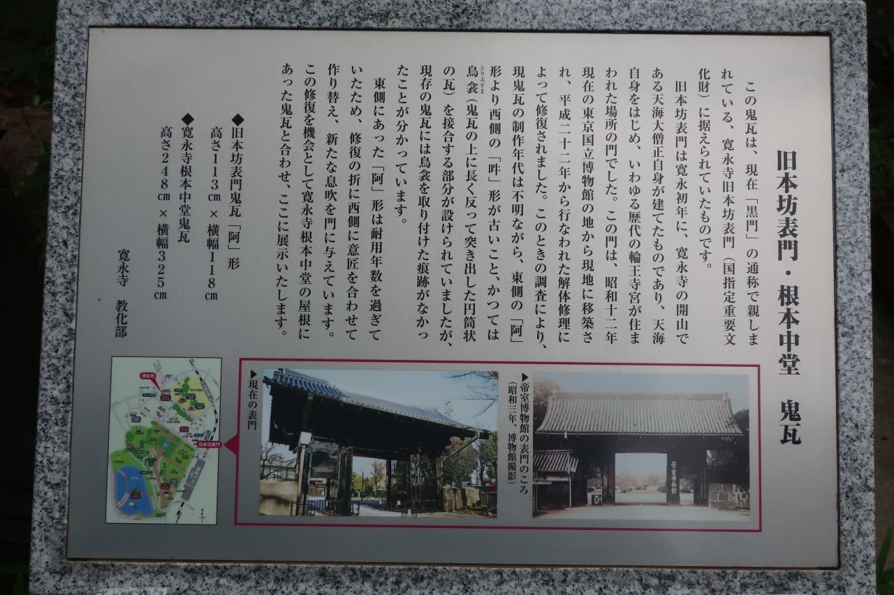 上野寛永寺の境内、本堂の右側には幾つかの石碑等の記念碑があります。その一つに旧本坊表門の鬼瓦、根本中堂の鬼瓦があります。旧本坊表門は寛永寺で唯一残った遺構であり、その修復の際に取り外した阿形の鬼瓦です。隣には同じく根本中堂に乗せられていた鬼瓦。