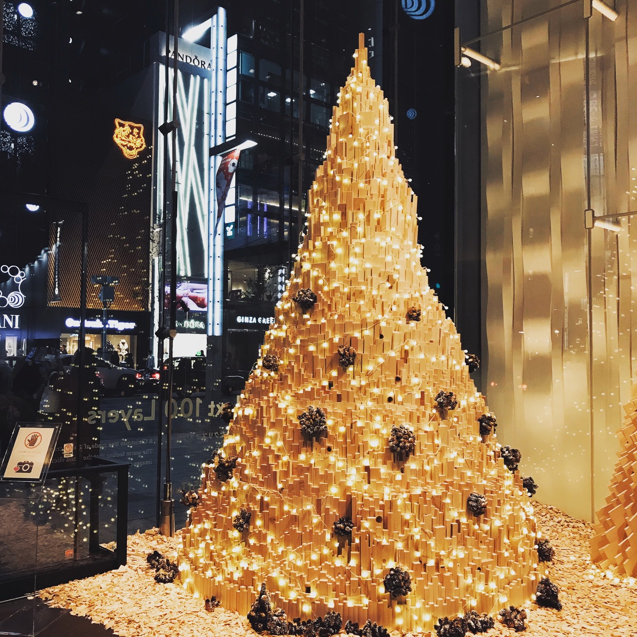 ピアノを作るときに発生する木材の端材で作られたクリスマスツリーでした。
