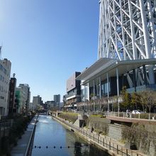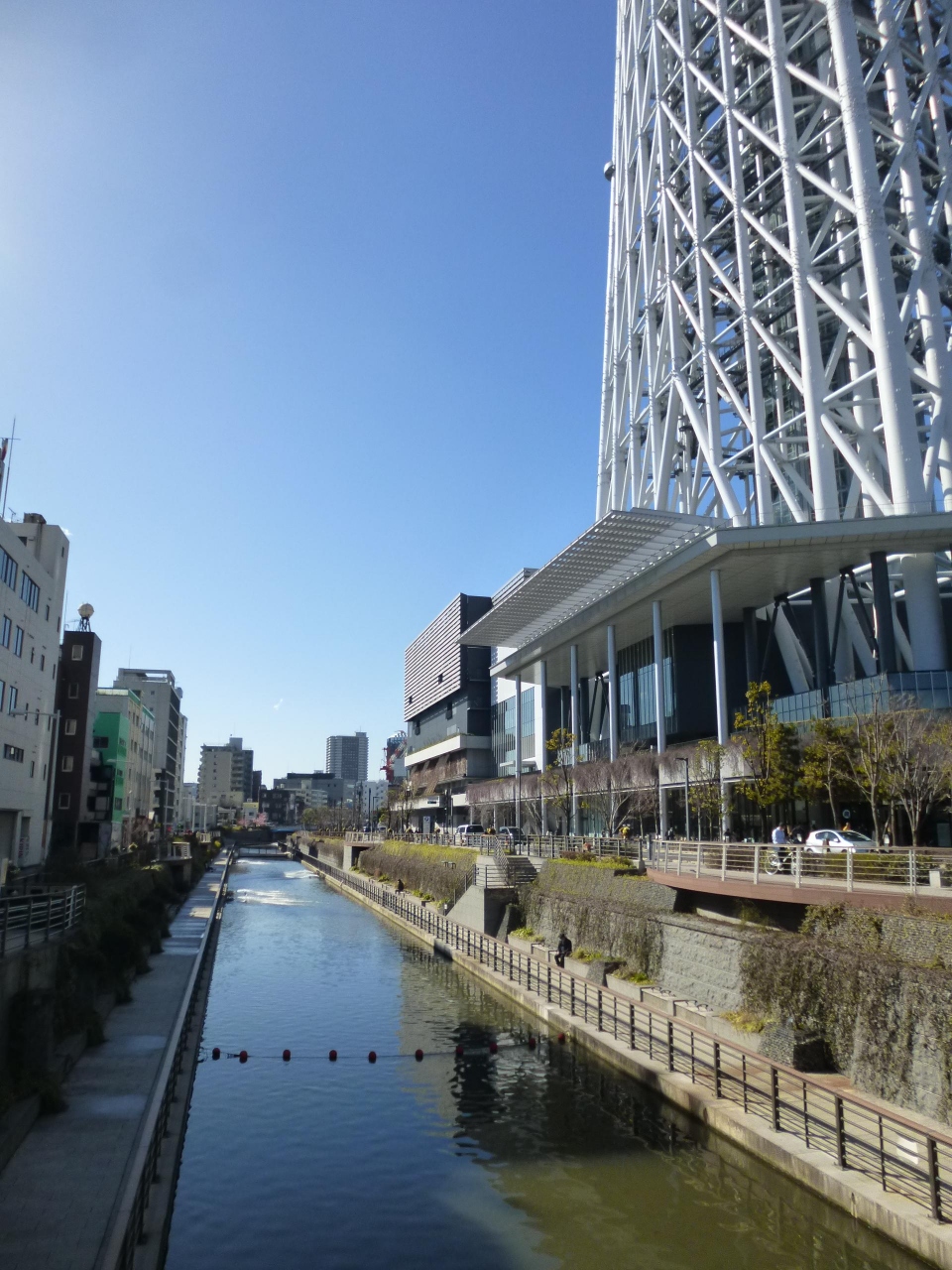 スカイツリーの足元、南側に整備された川があります。これが、北十間川です。江戸時代に開削された運河で、旧中川と隅田川を繋いでいる、区内で一番幅の狭い川だそうですが、江戸時代は多くの舟で賑わっていたのだろうともいます。今は、スカイツリーの写真を撮る人で、賑わっています。