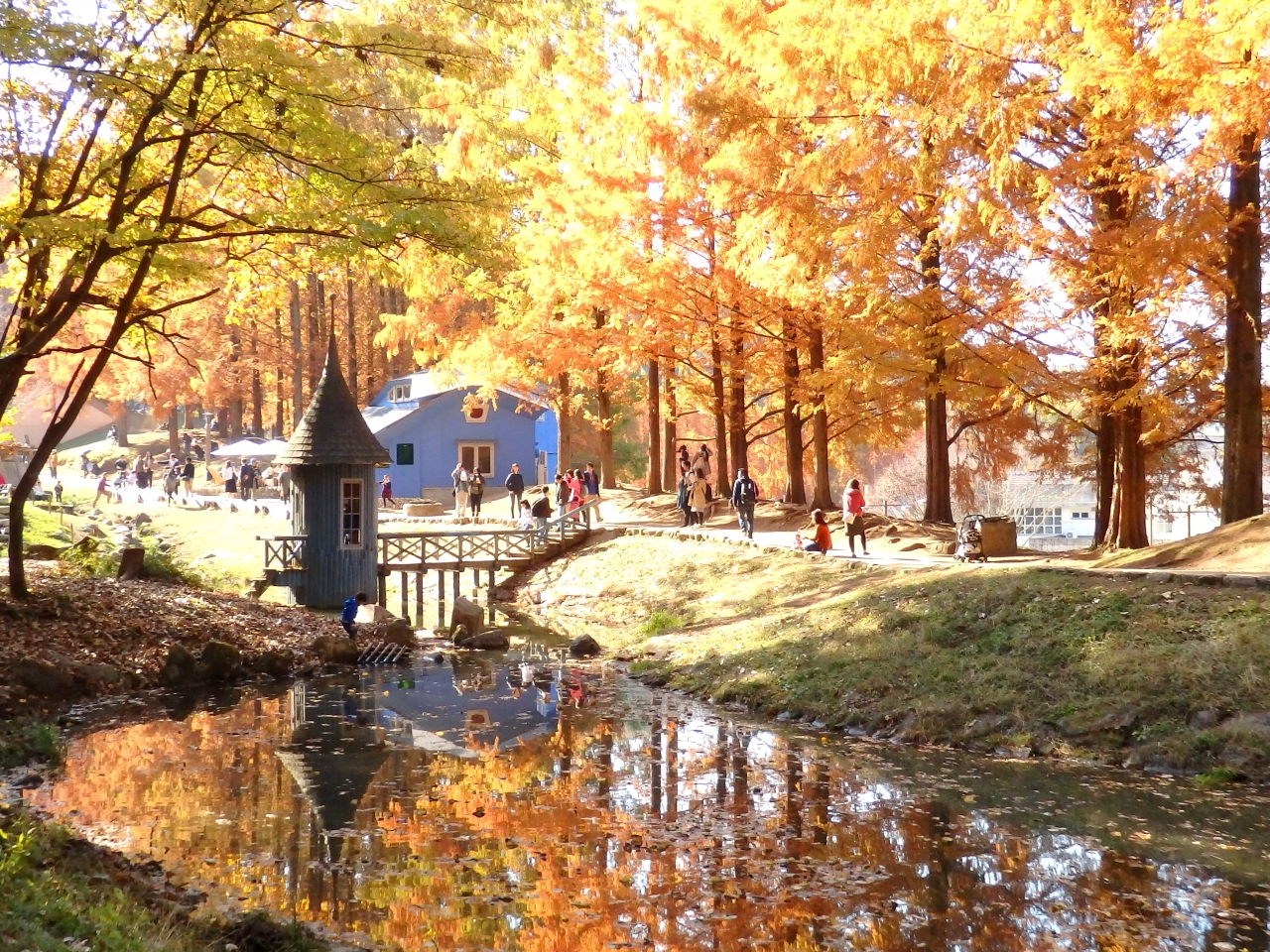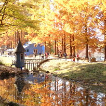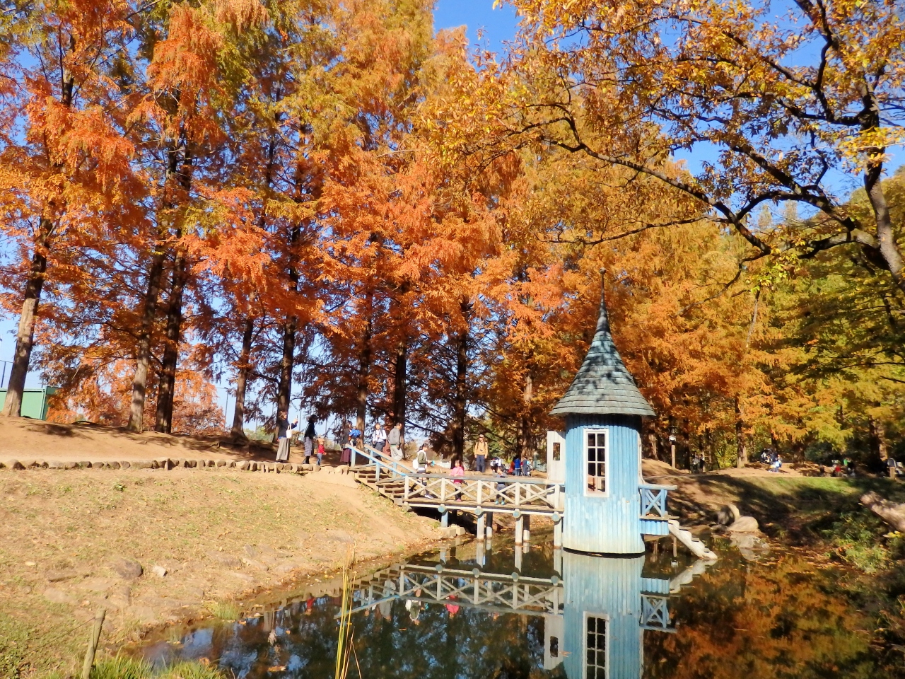 休日だったので、遊びに来ている親子連れ、紅葉見物に来ている方、写真撮影に来ている方で、園内はとても混雑していましたが、青空の下、あたたかなオレンジ色のあけぼの杉に包まれた公園はとても素敵でした。まさに童話の世界に入り込んだかのような雰囲気を醸し出していて、この時期に訪れる価値はあると思います。