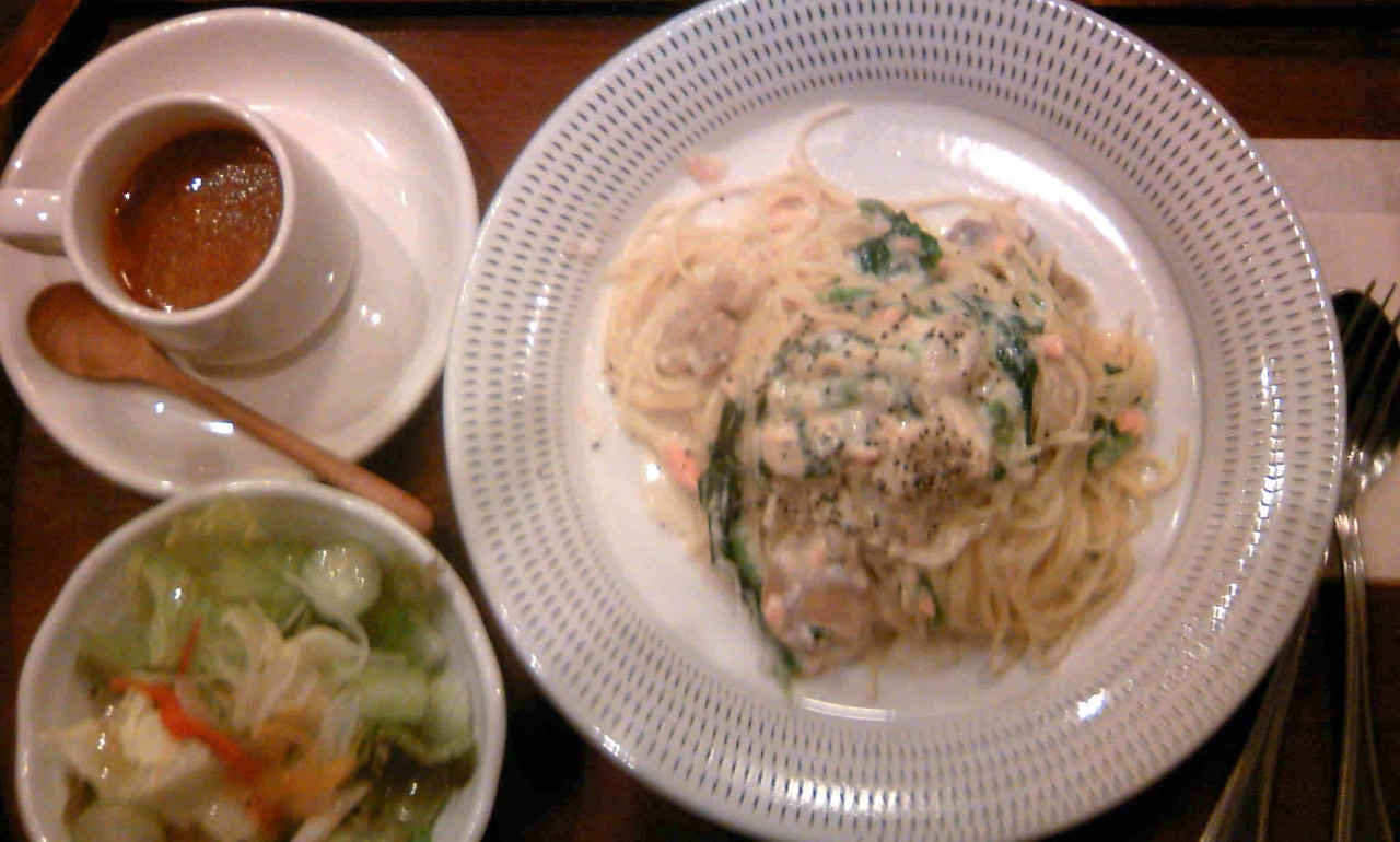 サラダとスープ付きのパスタ、食後にはコーヒーとデザートも頂きました。