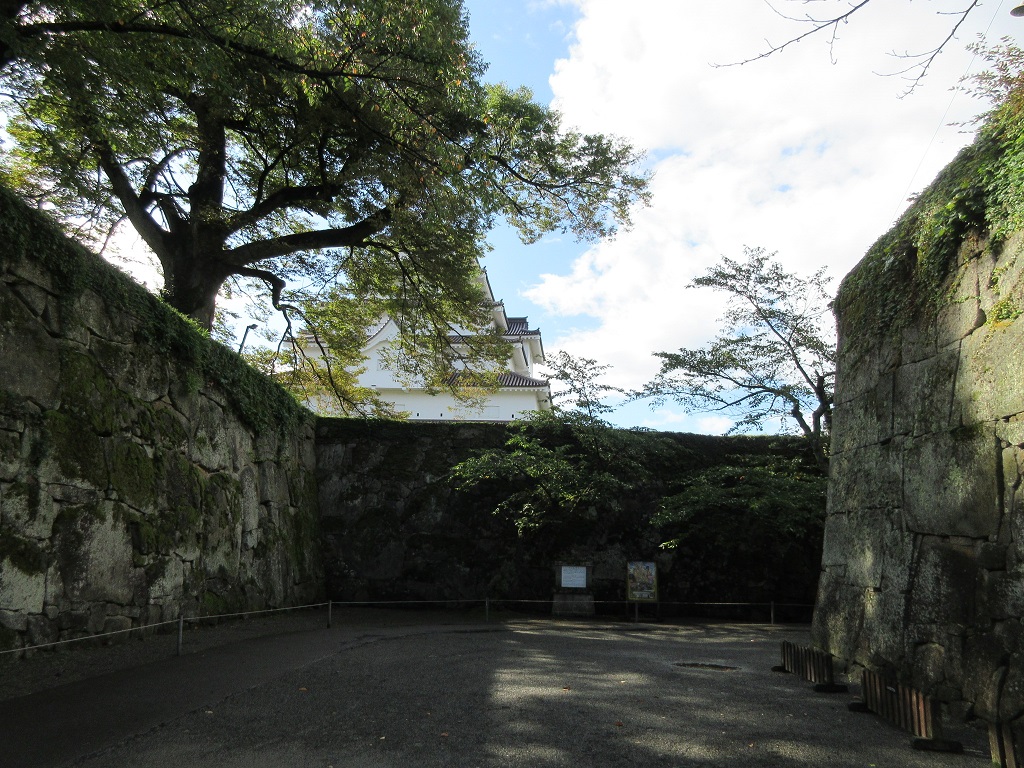 鶴ヶ城の入り口は東側の福島県博物館方面からのアクセスと北出丸からのアクセスがあります。この日はこの北出丸から天守閣の方へ向かったので、この太鼓門を通っていきました。多門櫓がもともとはあったようですが、今は櫓は失われて石垣だけが残っていました。クランクした造りは入城する高揚感を嫌が上にも強くしてくれました。