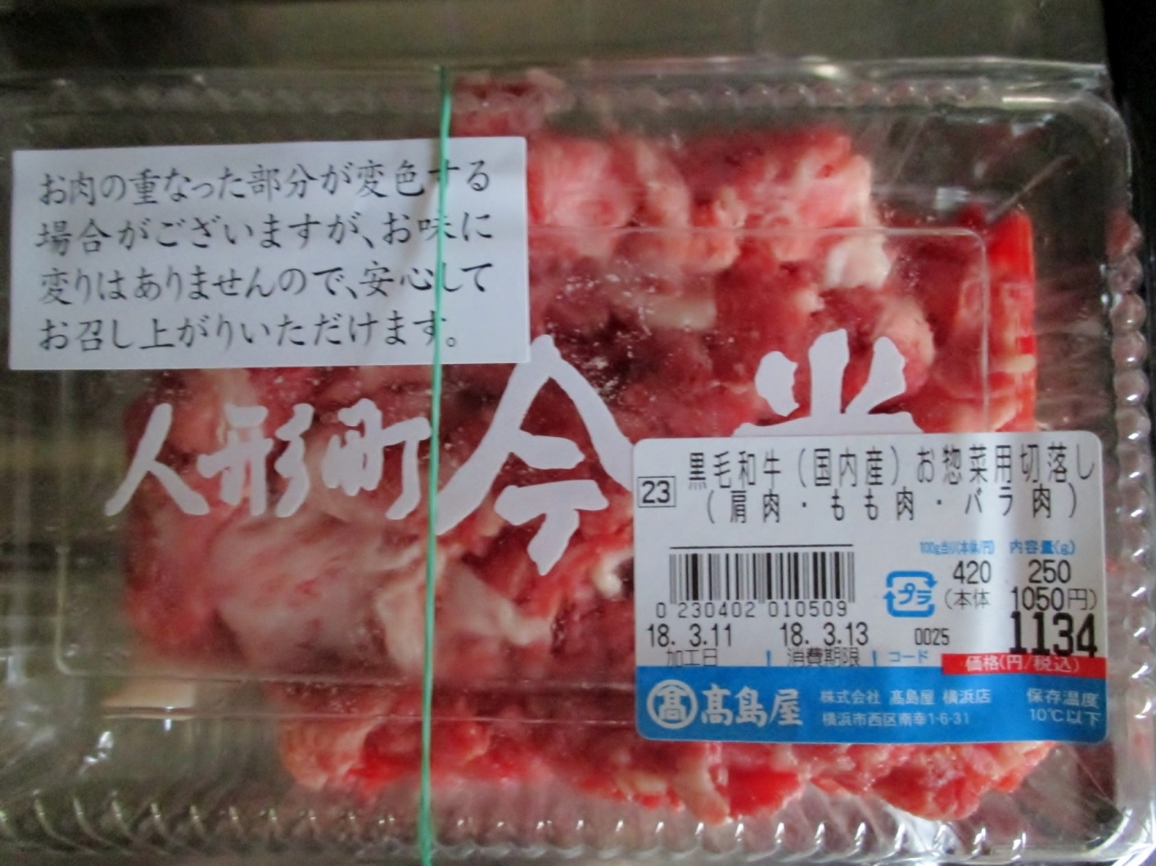 横浜高島屋、地下2階にある、人形町今半の精肉売り場で、黒毛和牛のお惣菜用切り落としを購入しました。高級肉が並ぶ中、これは比較的お手頃で買いやすいです。