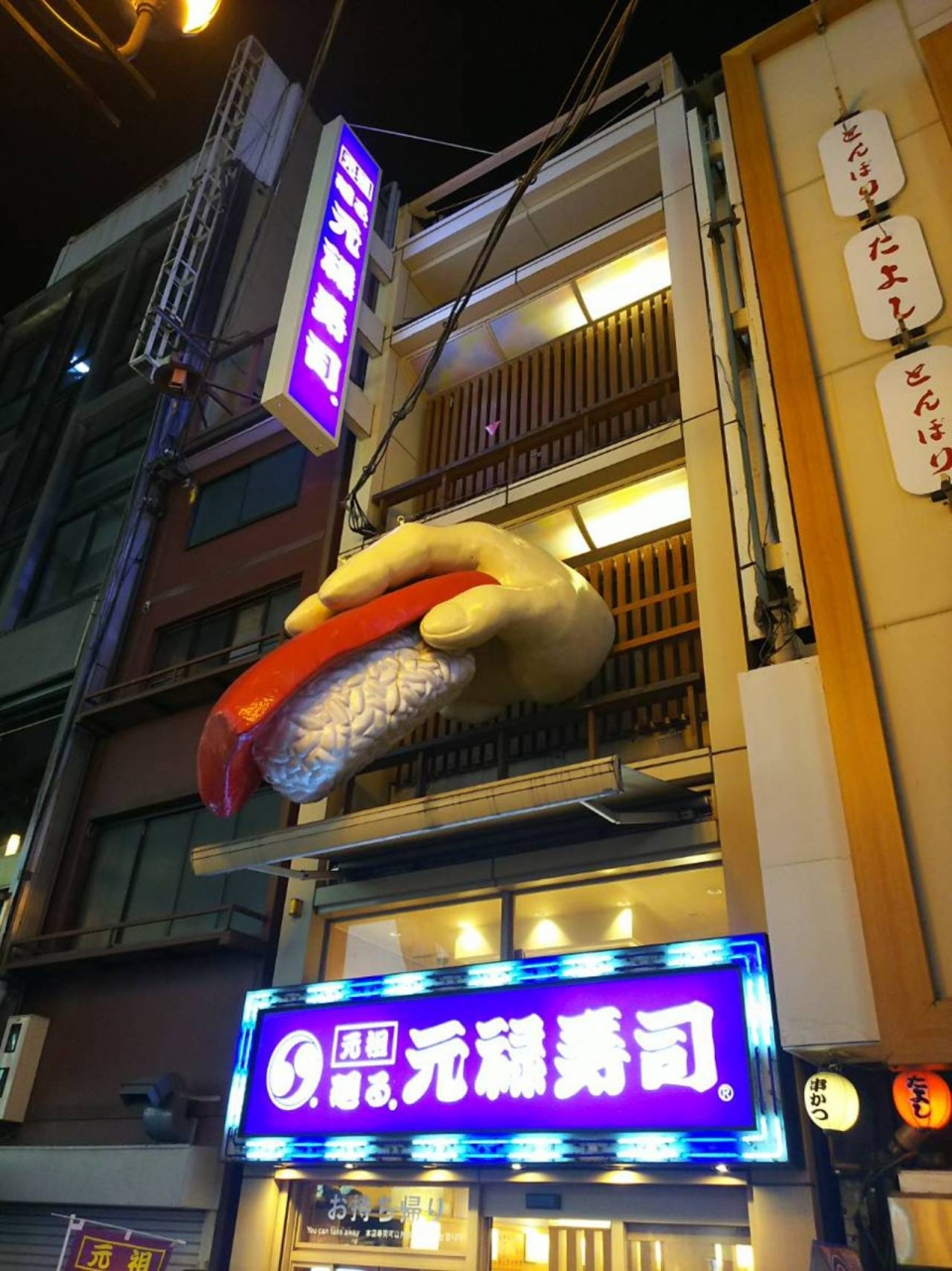 くいだおれの街「道頓堀」にある回転寿司屋さんです。道頓堀には、タコ、フグ、餃子などの大きなオブジェを飾るお店がたくさんありますが、このお店もインパクトのあるお寿司のオブジェが店頭にあるので記念写真の撮影スポットとしておすすめです。お寿司はお手頃な値段で食べることができ美味しいです。
