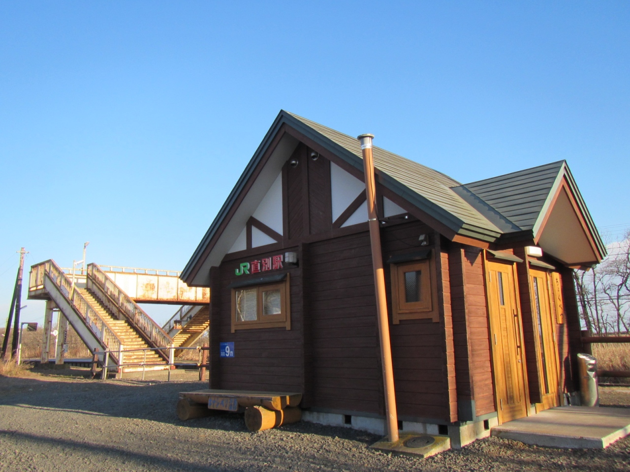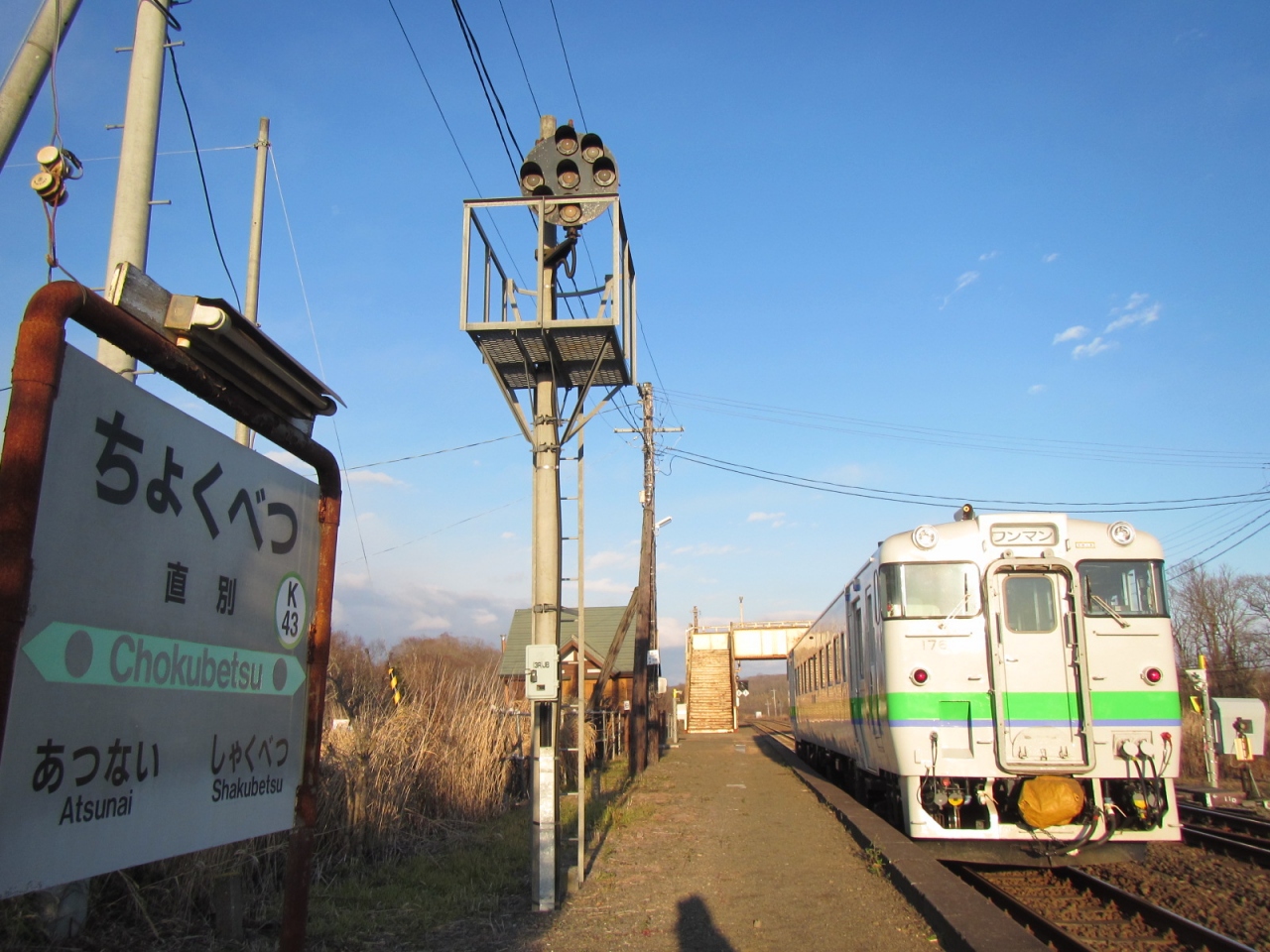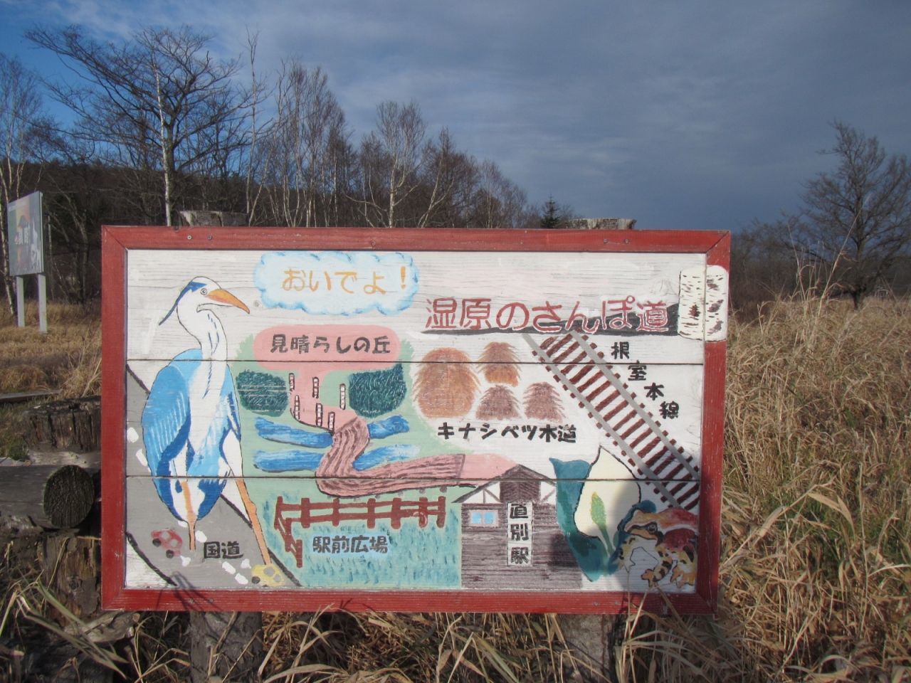 何も無い駅ですが、駅を降りると、キナシベツ湿原の散策路があり、見晴しの丘まで約10分程度の散策が楽しめますが、整備された木道は入口のところわずかで、その先は半ば朽ちかけていたり、周辺の木々が倒れこんだりしていて、あまり手入れがされていないやや荒れた散策路で進むのに難儀しました。