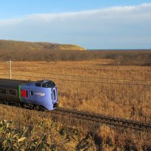見晴しの丘は、直別駅東側、目の前の国道は切通しとなっていて、標高15m程度の場所から遠くの海やヘシヘハケ岬、キナシベツ湿原の様子が眺められ、眼下を根室本線の列車が通るちょっとした撮影ポイントにもなります。