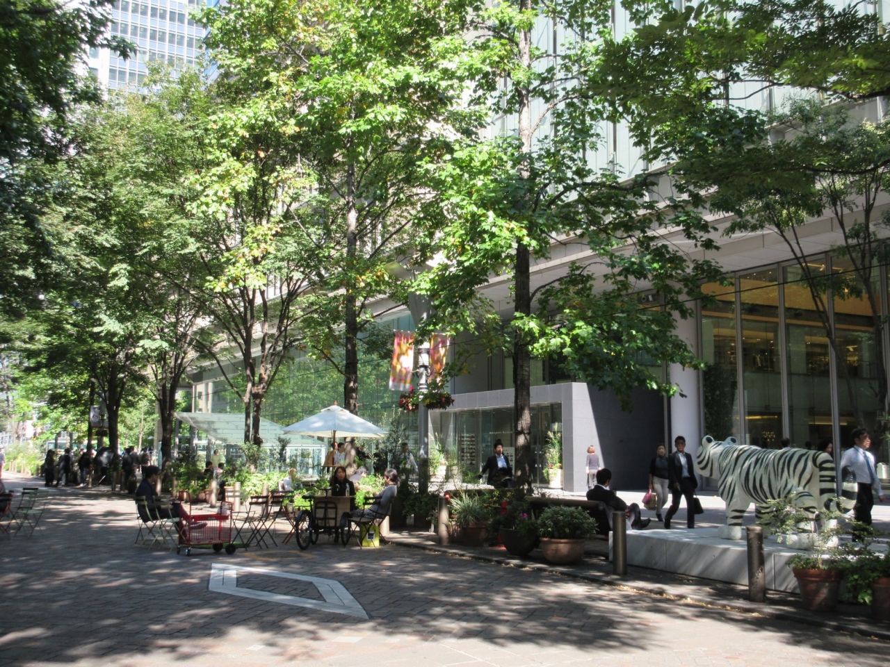 お昼どきは歩行者天国になって、車道にはチェアやテーブルが並べられて、オフィス街の憩いの場になってます。高級そうなブティックのデコレーションを眺めながら歩いて、一服してスタバのコーヒーをたしなむ。なかなか良いひと時が過ごせます。