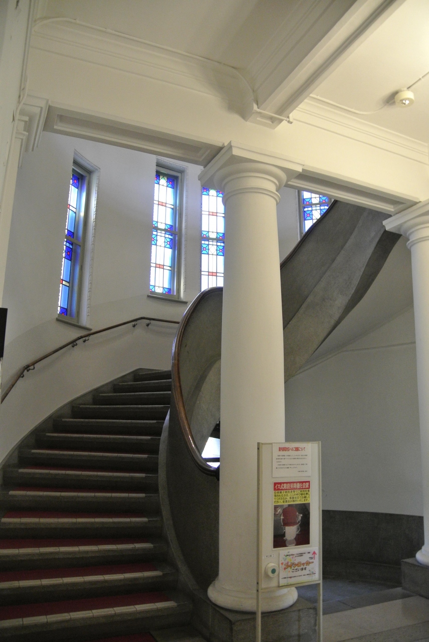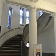 印象的な階段とステンドグラスと太い柱
