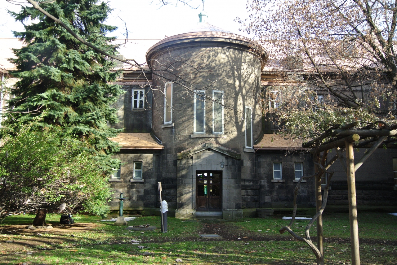裁判所らしく、入り口上部には天秤と目隠しをした女神の顔の彫刻がありました。建物としての見所はやはり玄関を入った所にある階段部分。それほど広い空間ではありませんが、太い柱に、うねった階段、ステンドグラスがとても効果的に目に飛び込んできます。この階段部分は建物の裏側から見ると、丸い塔のようになっています。建物に興味のある方はぜひ裏庭からも眺めてみてください。