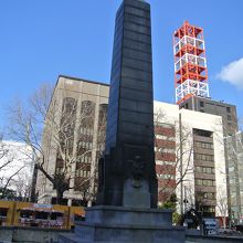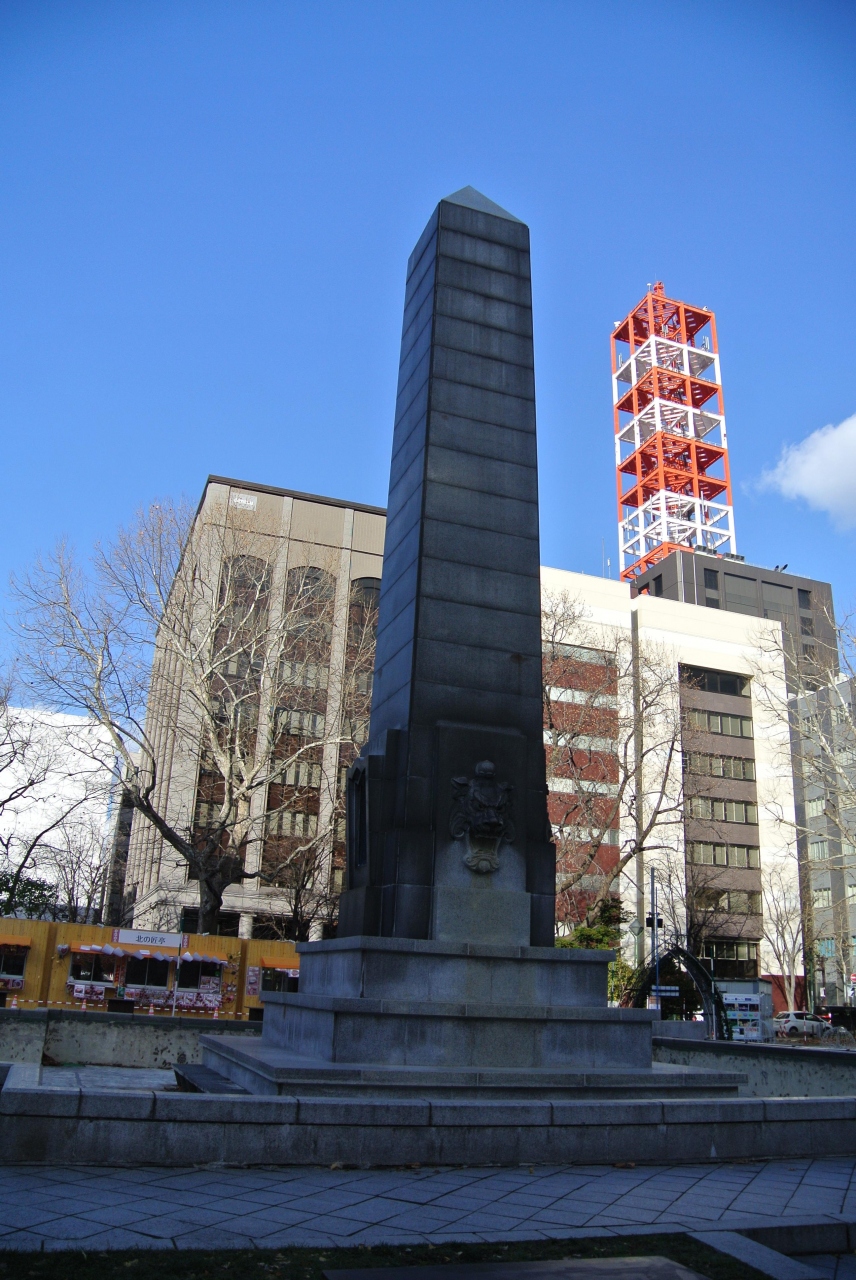とても大きな碑なので、すぐそれとわかります。ちょっとオベリスクを思い起こさせるような形の碑です。下部にはライオンならぬ、何の顔でしょうか、字体といい、これが建てられた時の時代の空気が感じられるような気がします。11月の終わりで、噴水は出ていませんでした。