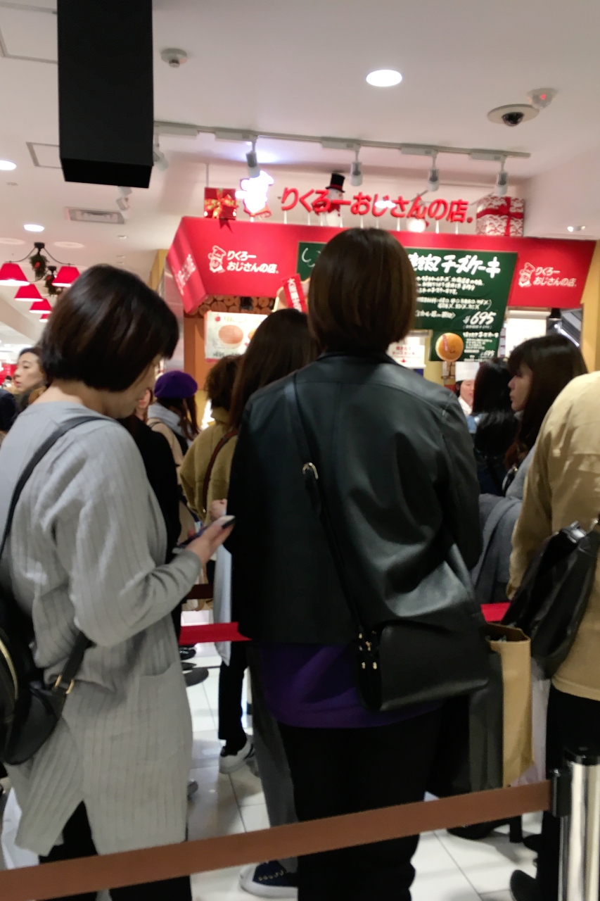 大阪にしかないチーズケーキの銘店です。おいしいし、量もあるのに1000円しない安さだけあって、週末ともなると非常に混雑します。この日は日曜日の夕方だったせいか、30分以上並ぶことになりました。混雑している大丸梅田店のなかでも別格の混雑ぶりでした。