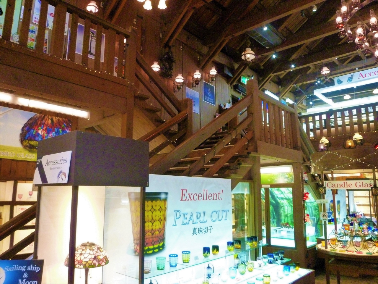 堺町通りに`北一硝子三号館;旧木村倉庫/和の建屋/カントリーフロア`があって、道路の反対側に[北一硝子見学工房とクリスタル館]がありました(見学工房は写真禁止/無料でした)。 流石、長いパイプでその先にはガラス塊が~みるみるうちに形(製品)に,,。ガラス工芸を一言で言ったら`クリスタル`;結構良い名称ですね(^o^) クリスタル製品のと木材の二階建てが見事でした!