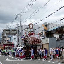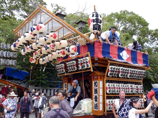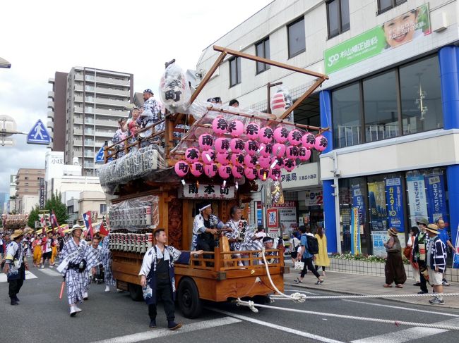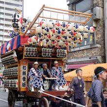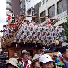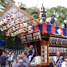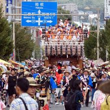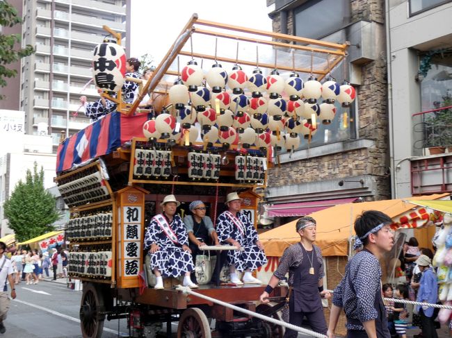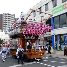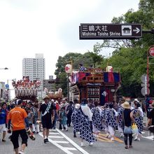 三島大通り商店街は歩行者天国になって、沢山の山車が引かれて、山車の上のしゃぎりが通りに響き賑やかです。