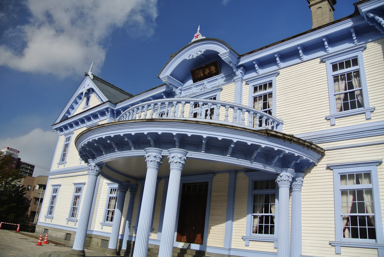 薄い紫というか水色というか(パンフレットにはウルトラマリンブルーとありました。)外壁の枠や柱の色が得も言われぬ色合いがとても素敵です。ロビーには両端に同じようなデザインの階段があるというのがちょっと変わっています。部屋にはそれぞれ花の名前が付けられていて、当時の部屋が再現されたり、天皇陛下が使われた品々なども展示されていて見所も多いです。すすきのからはすぐ近くですし、地下鉄中島公園からもすぐですので、散歩がてら行ってみてはいかがでしょうか。