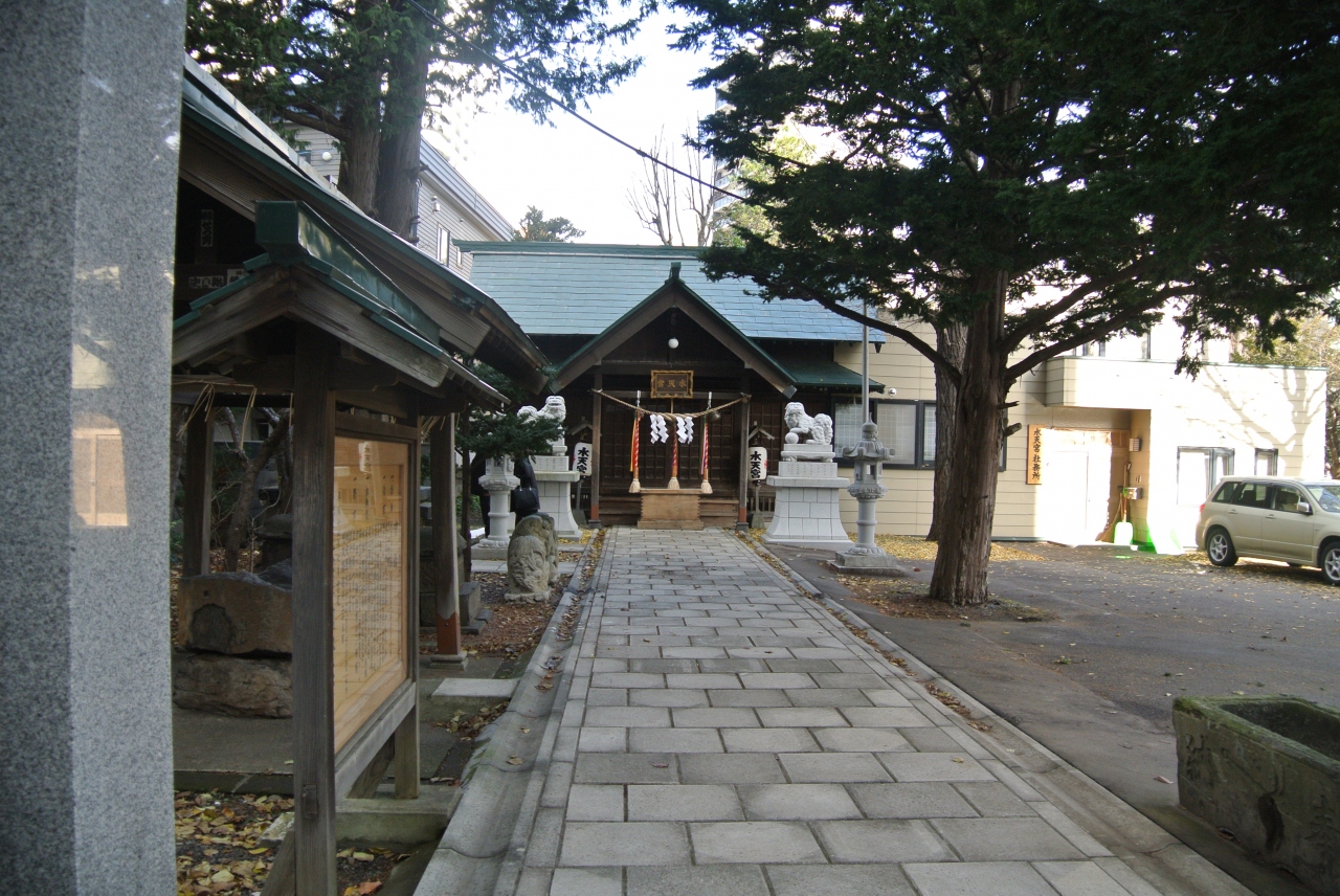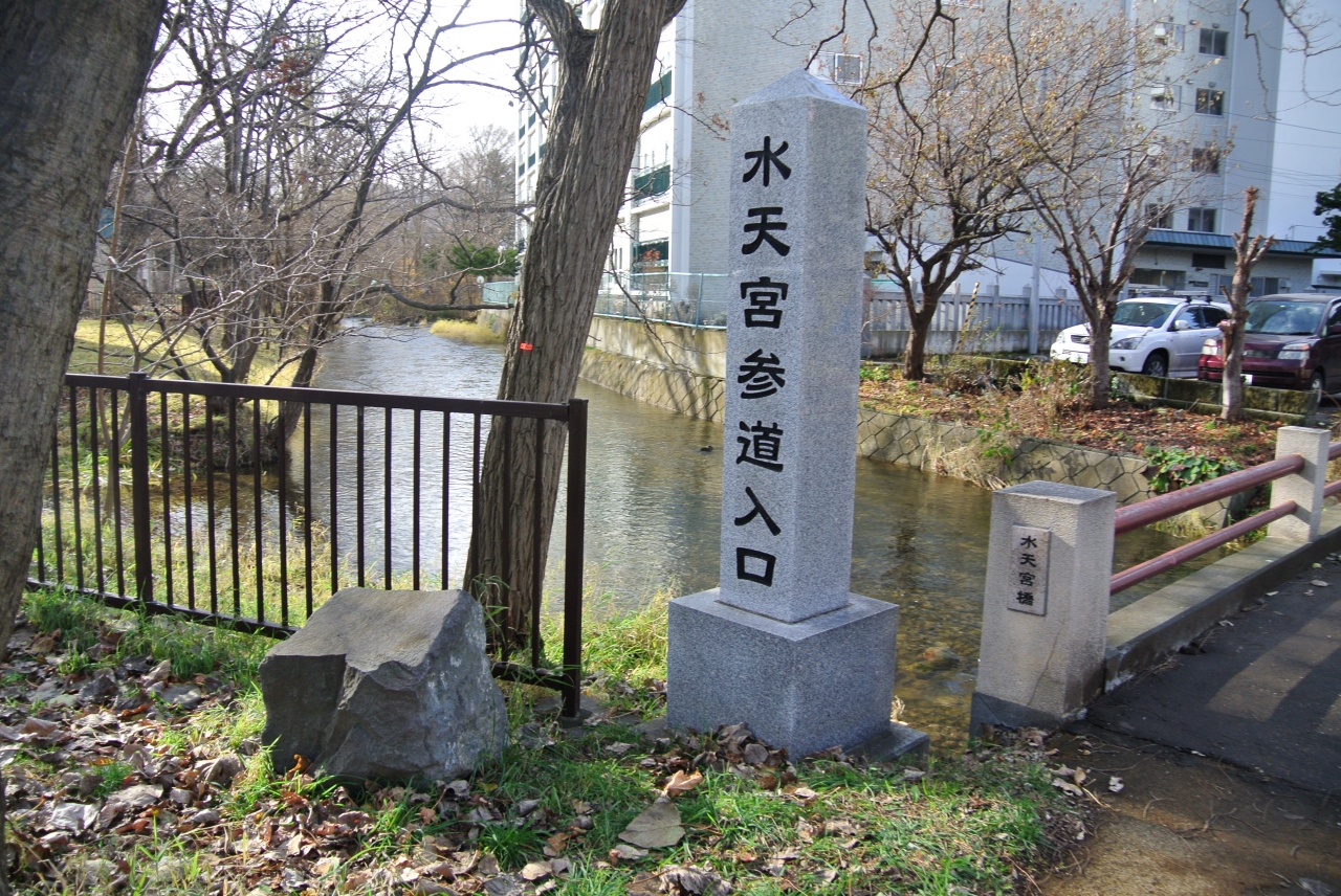 地下鉄中島公園駅をあがってすぐ、鴨々川を渡ったところにあります。橋のたもとに「水天宮参道入口」と石碑があって、川を渡るのがちょっと異界に行くような雰囲気がします。といっても、神社の境内は広いものではなく、周囲には民家もあってそれほど荘厳な雰囲気ではありません。気軽にお参りできる神社です。