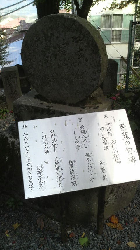 四角い台座に少々苔むした丸い石碑が乗っていて、芭蕉が詠んだ「初時雨…」の句が刻まれていました。