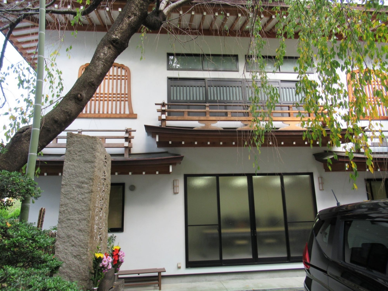 山門を入ると左手に広くはないが背の高い竹が生えた植え込みがあり、正面が本堂だが、まだ新しいうえあまりお寺らしい感じのしない造りです。
