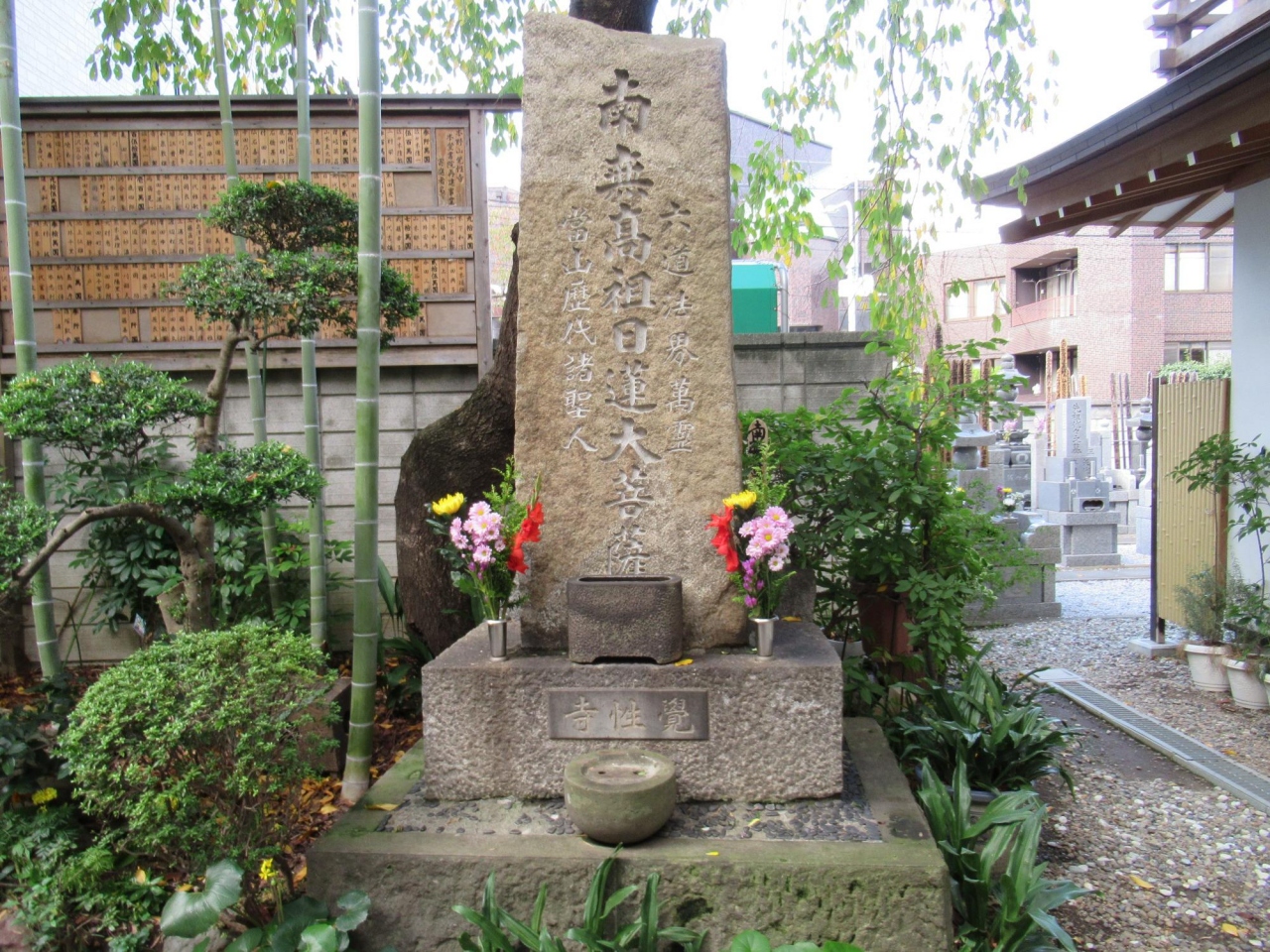 が、植え込みの本堂近くに、「南無高祖日蓮大菩薩」と彫られた大きな石碑に綺麗な花が供えられ、台石の「寺性覺」が、右横書きであるのを見ると歴史を感じます。