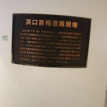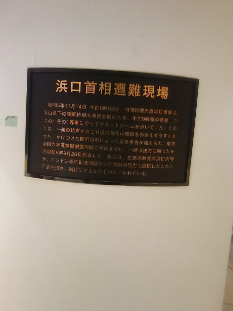 昭和初期に事件のあった現場です。日本の近代史におけるテロの事件の一つと言われているのがこちらの場所で行われた。 東京駅の中央コンコースにあり駅の柱に説明文が変えて蟻足下には狙撃現場がダイヤモンドの形で記されている。東京駅でこのようなことがあったことに驚かされますが柱に書かれているパネルがなければ気づかれないぐらい素通りしている状態でした。東北新幹線の入り口ぐらいの所にありますので赤レンガを含めて東京駅の歴史としてもう少しわかりやすくするのがいいと思う。