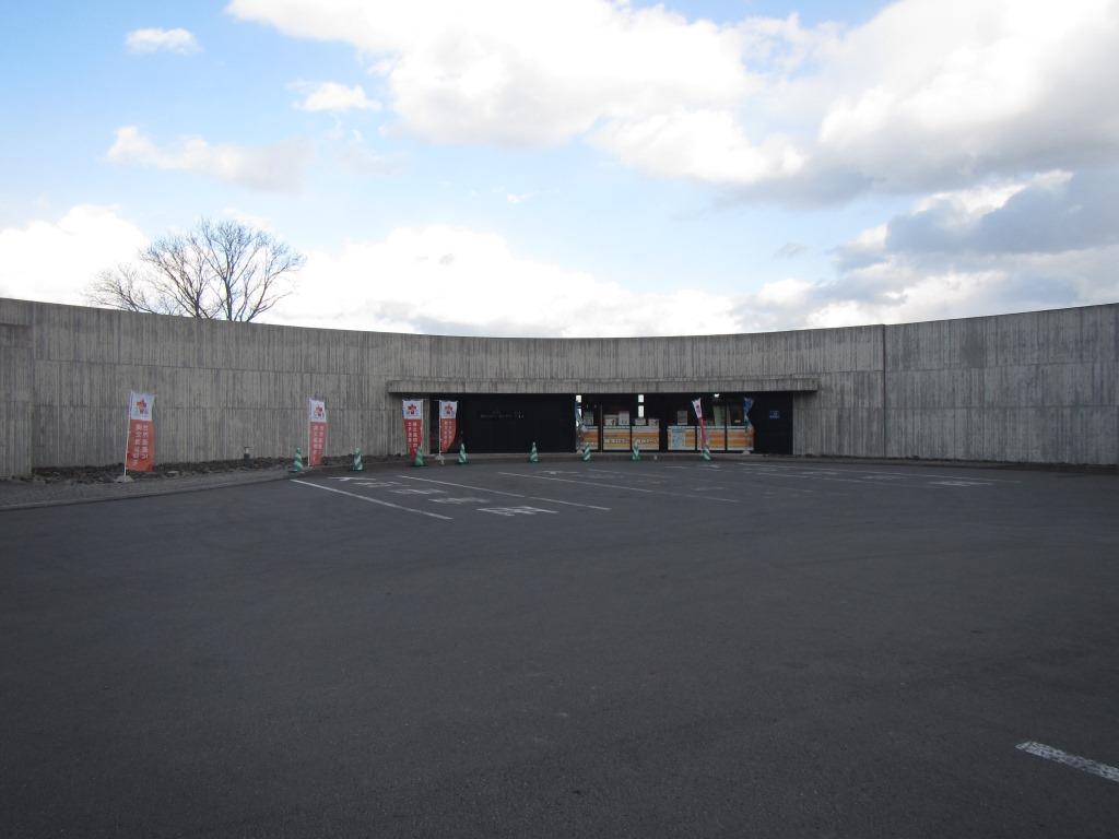 弧を描いた形の建物に、コンクリート打ちっぱなしの壁。