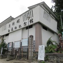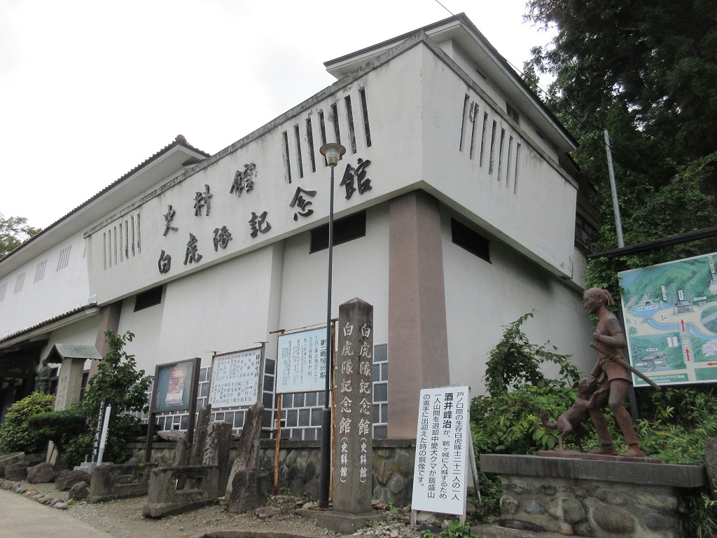 飯盛山を訪れ、白虎隊の19人の眠る墓地を訪れた後で、階段を降りていくとこちらの記念館にアクセスできました。2階建ての小さな建物で、それほど大きな施設ではありませんでした。道に近い一隅には、白虎隊の生存者である酒井峰治を愛犬クマが出迎える像が置かれていました。