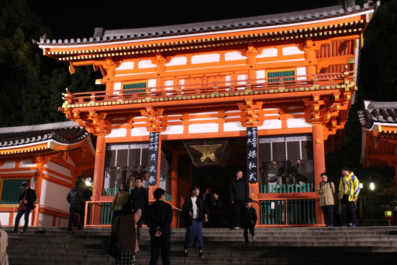 昼間もにぎやかですが、夜も境内は自由で、本殿や鳥居も明るくなっており、とても風情がありました。