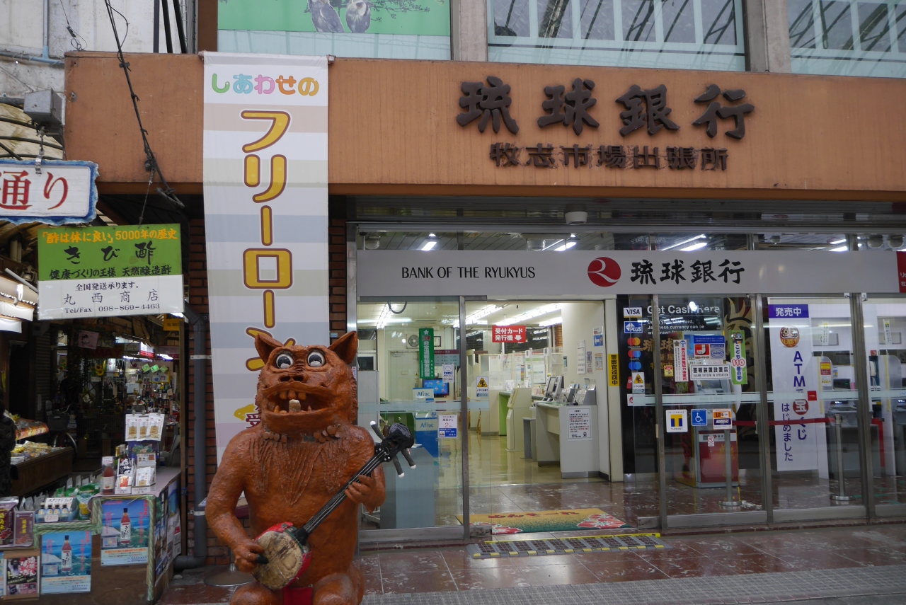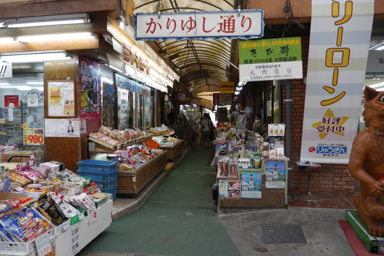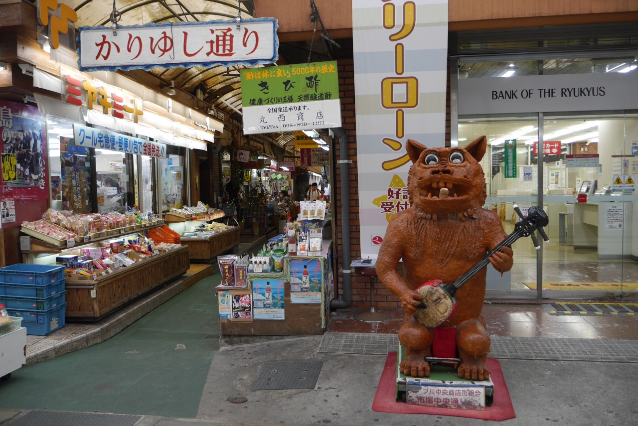 那覇市の国際通りから市場本通りを進み、市場中央通りを歩くと琉球銀行牧志市場出張所があり、大きなシーサーが飾られていて、そこに狭い路地があり、ここがかゆりし通りです。