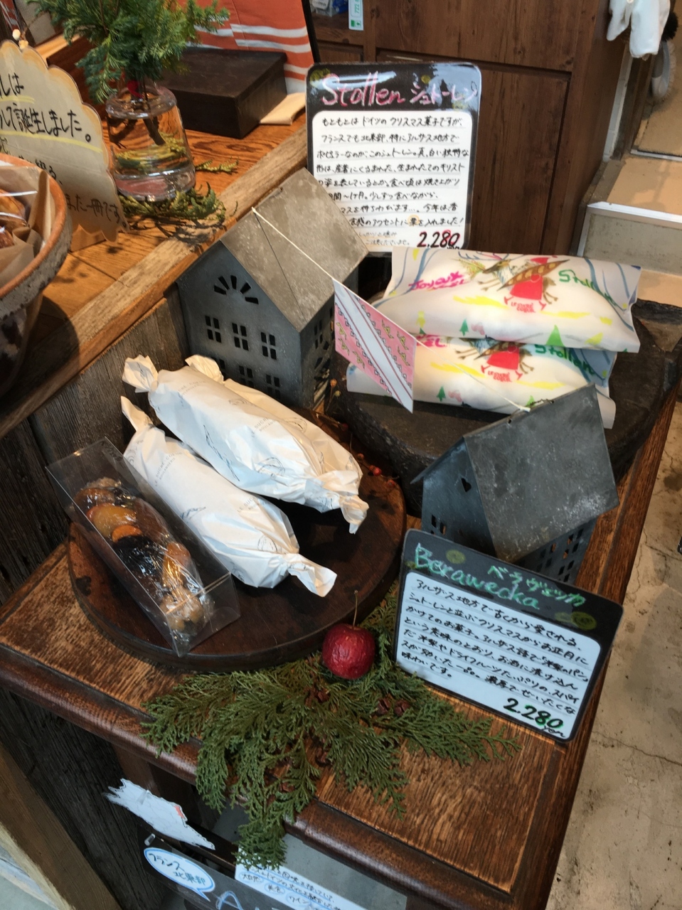 少し久しぶりにうかがったところ、平日の昼間でしたが行列はほとんどありませんでした。こちらはケーキ屋さんのようにショーケースの中から店員さんにパンを取ってもらう仕組みです。クリスマス前なので、いつもはシュトーレンを買っていたのですが、今年はベラヴェッカというドライフルーツとスパイスが練りこまれた濃厚なクリスマスのケーキと、パンを数種類買いました。お値段は少し高めですが、素材にこだわりもあるどれも美味しいパンなので、つい買い過ぎてしまいます。