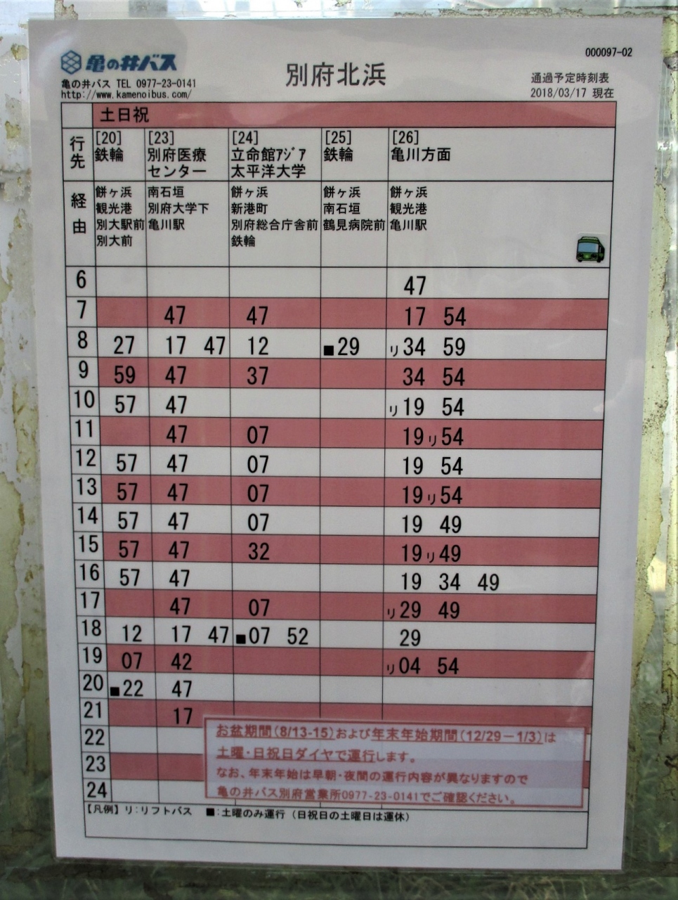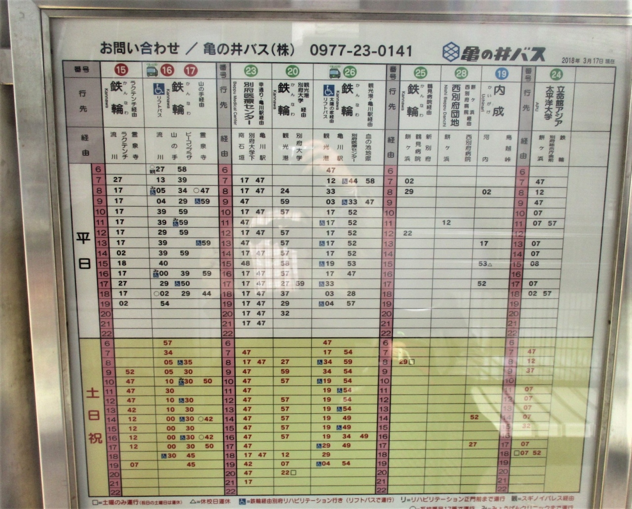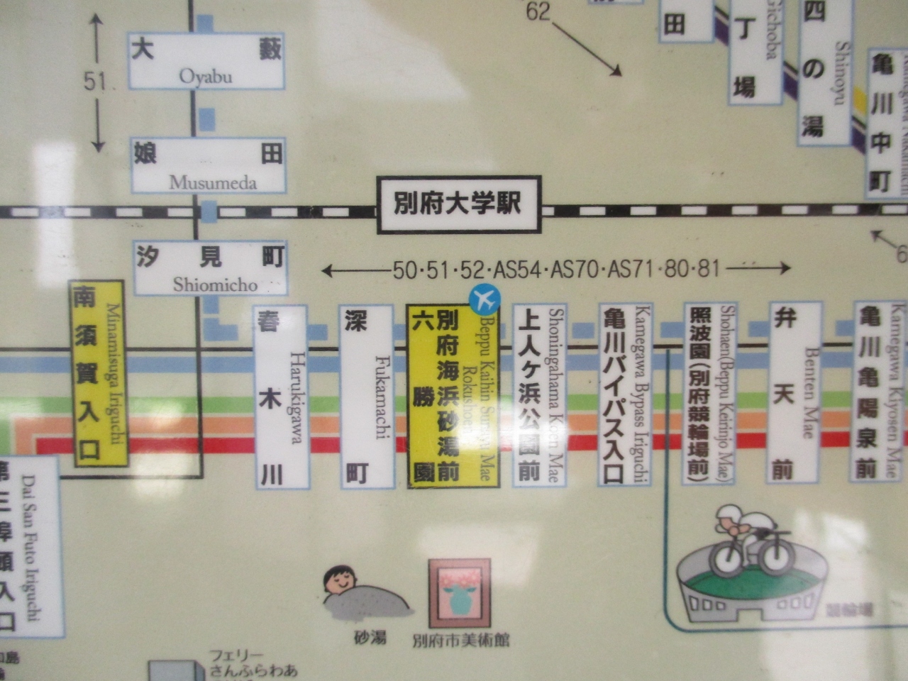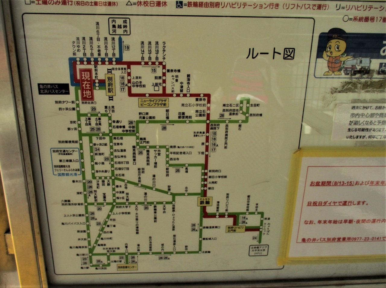 別府市内の路線はほとんどが30分から1時間間隔で運行されるため、利便性が高く、また路線が網目状になっているので、乗り継ぎが比較的便利でした。