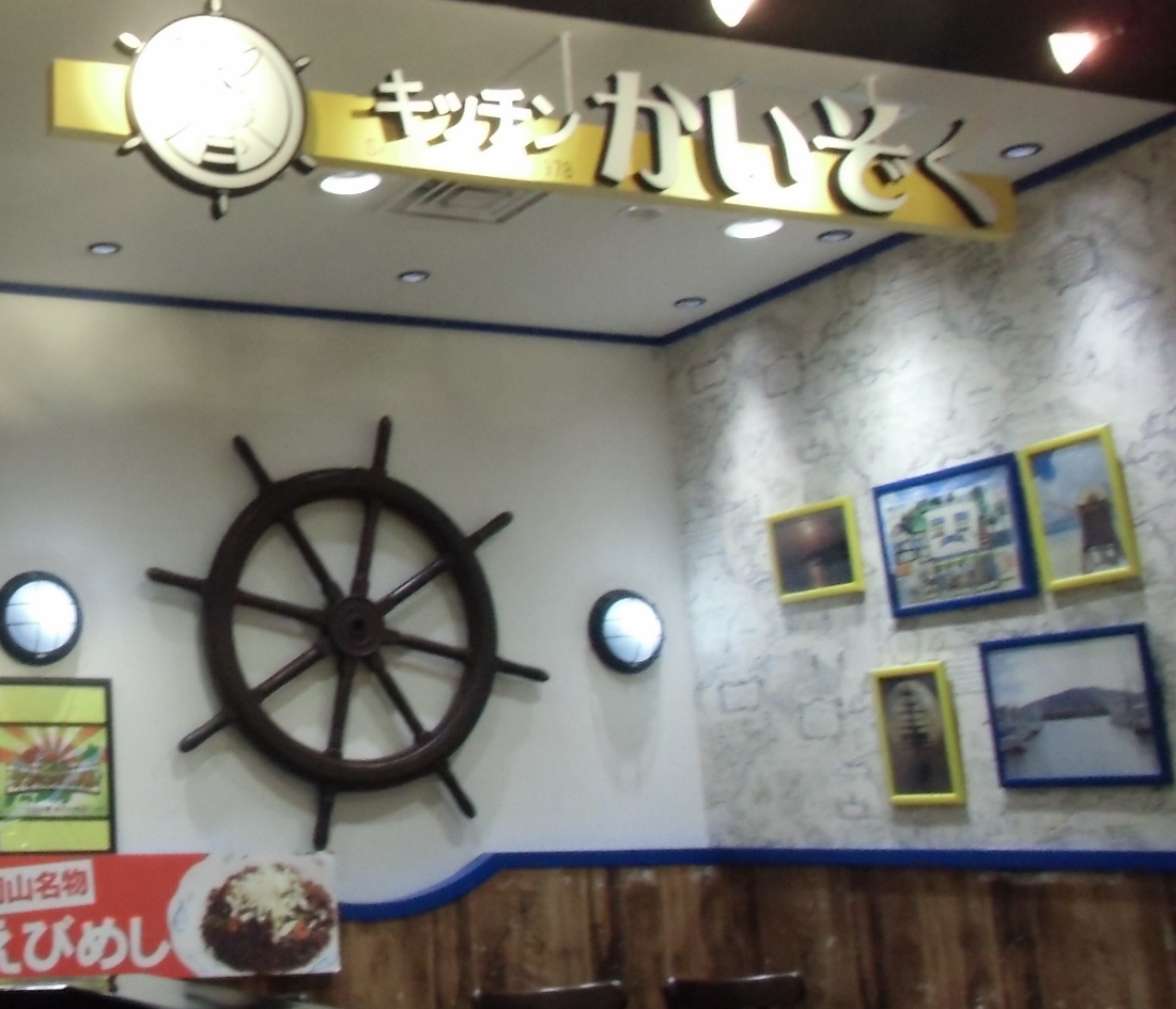 牛窓でえびめしでお馴染みの「キッチンかいぞく」の天満屋地下の晴れの国キッチン内の店舗。牛窓のお店にあるような木彫りの人形が小さいながらも置いてあります。持ち帰りもできます。茶色いえびめしは見た目ほど辛くないのでカレーやオムライスにもよく合います。