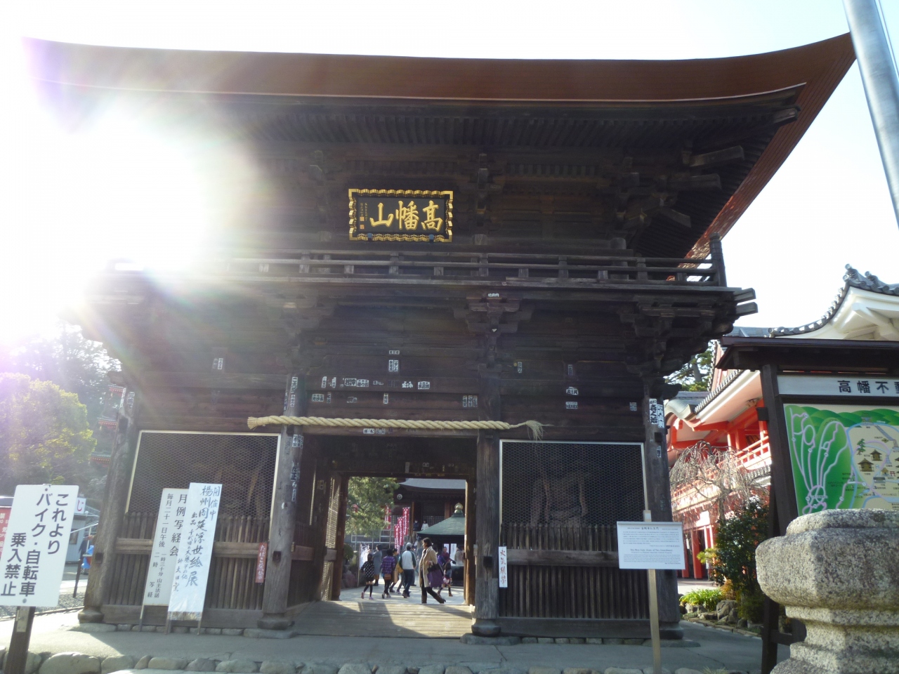 門前町商店街を抜けると見えてくる仁王門。歴史を感じる面向きで金堂力士像も迫力があります。この門は、楼門として計画されていたみたいですが、上層の主要部に屋根がかけられ外観は単層だったみたいです。高幡山の文字が金色で古い門を一層引き立てています。