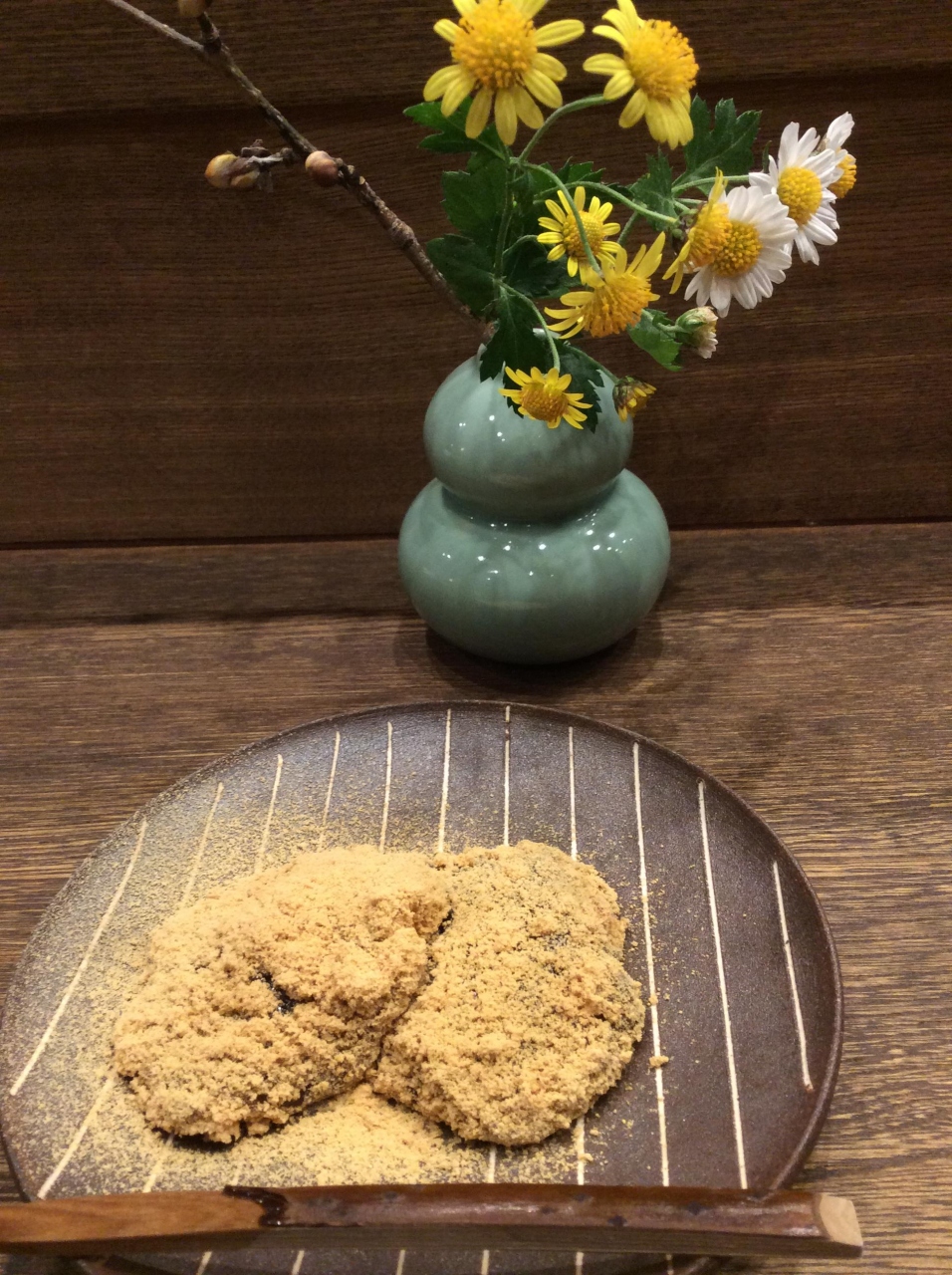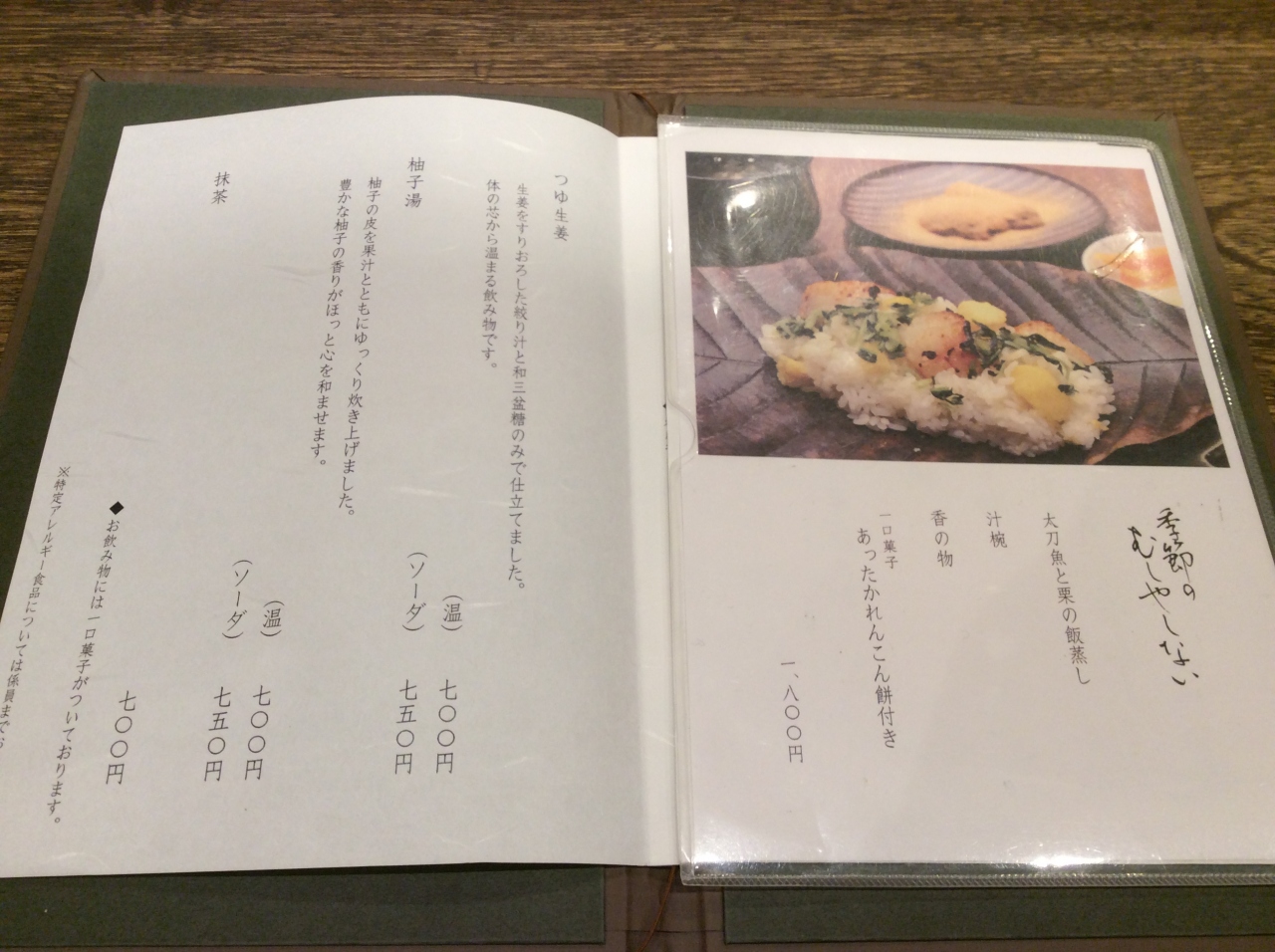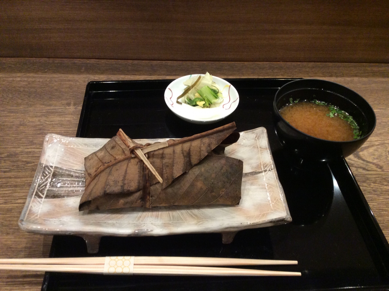 ここの鯖寿司でも食べようかと立ち寄ったら、朴葉に太刀魚と栗とおこわを包んで焼いたもの+お吸い物+漬物+デザートにレンコン餅のきな粉まぶし、のセット1800円というのを見つけて、着席。