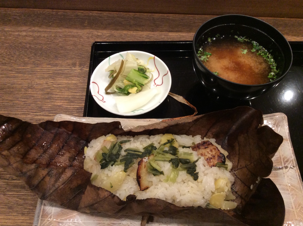 太刀魚と栗のおこわ、朴葉包み焼きにお吸い物と漬物、レンコン餅で1800円税別