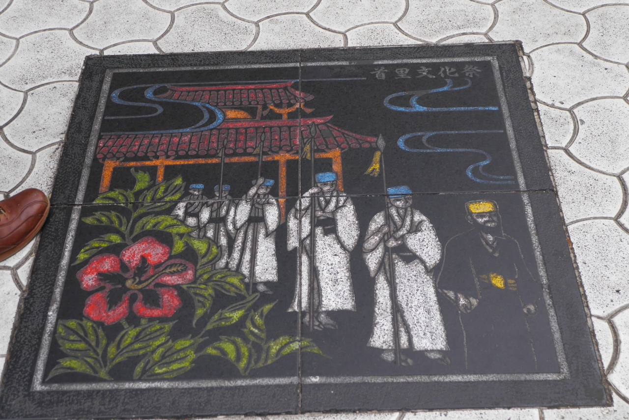 三線を持ったシーサーの居る琉球銀行前の通りの路面には首里文化祭の柄のタイルが埋め込まれ、沖縄らしさを表現しています。沖縄雑貨の他、青果店等が並び、生活に密着した商店街になっています。