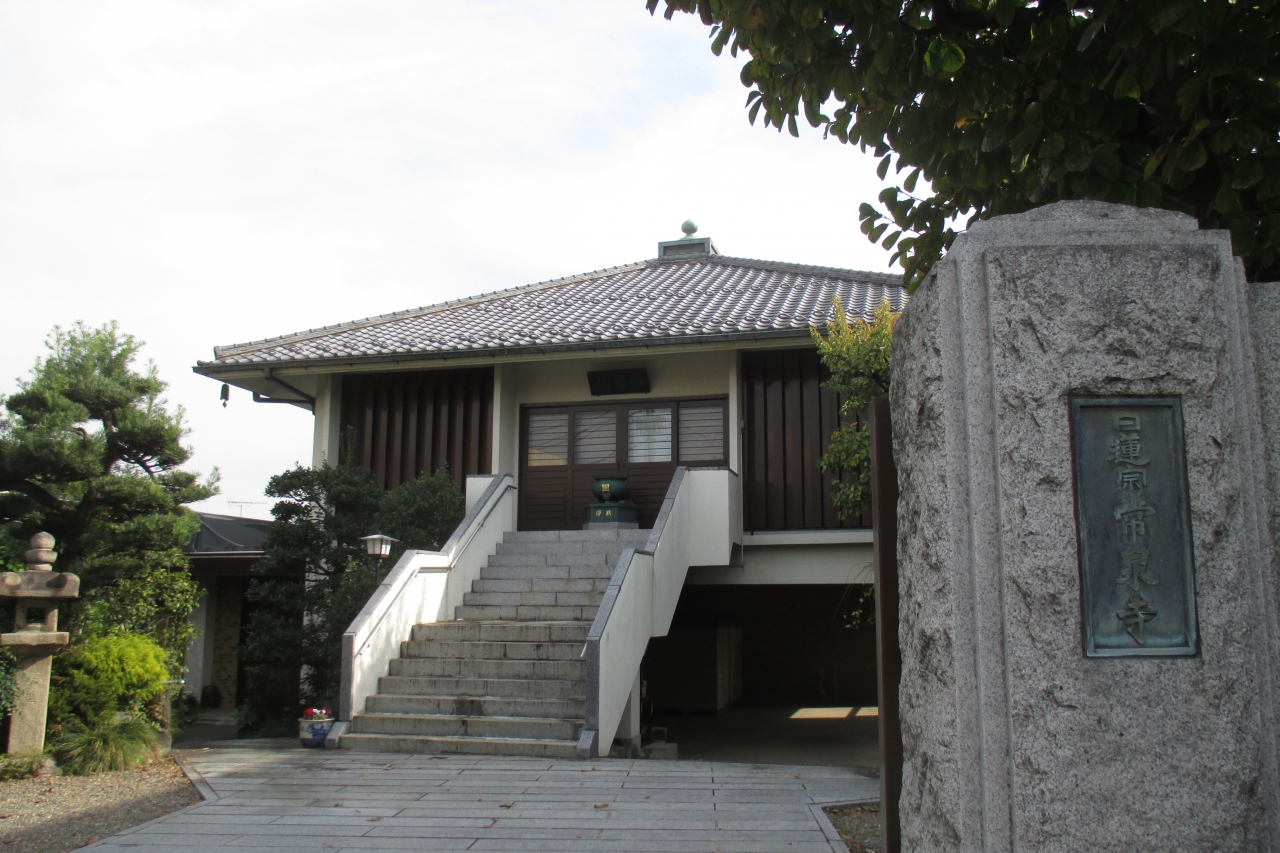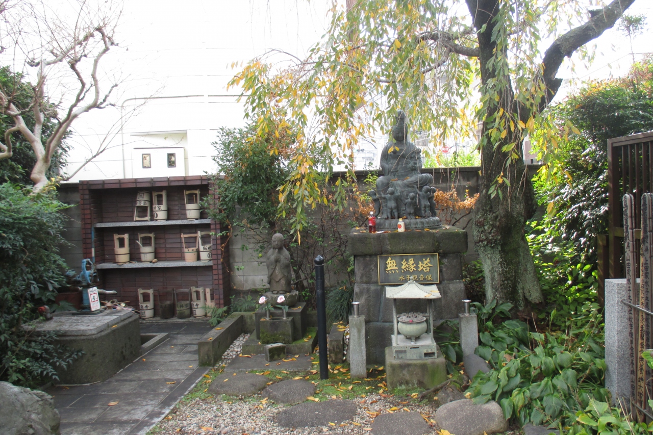 常泉寺は早稲田通りから若松町までの夏目坂通りの中間辺りにありました。近年の再建と思われる本堂ですが、直線のきっちりとした感じの建物です。その分、屋根の上に乗っている宝珠の丸みが印象的です。境内もちり1つ落ちていない感じで、本堂とともに隙がなくて一見冷たく感じてしまいました。でも、境内の右端にある無縁塔/水子観音像を見たら落葉がたくさん落ちていてホッとしました。創建は寛永8年(1631年)とのことですから、近隣のお寺さんと同じ様な時期です。