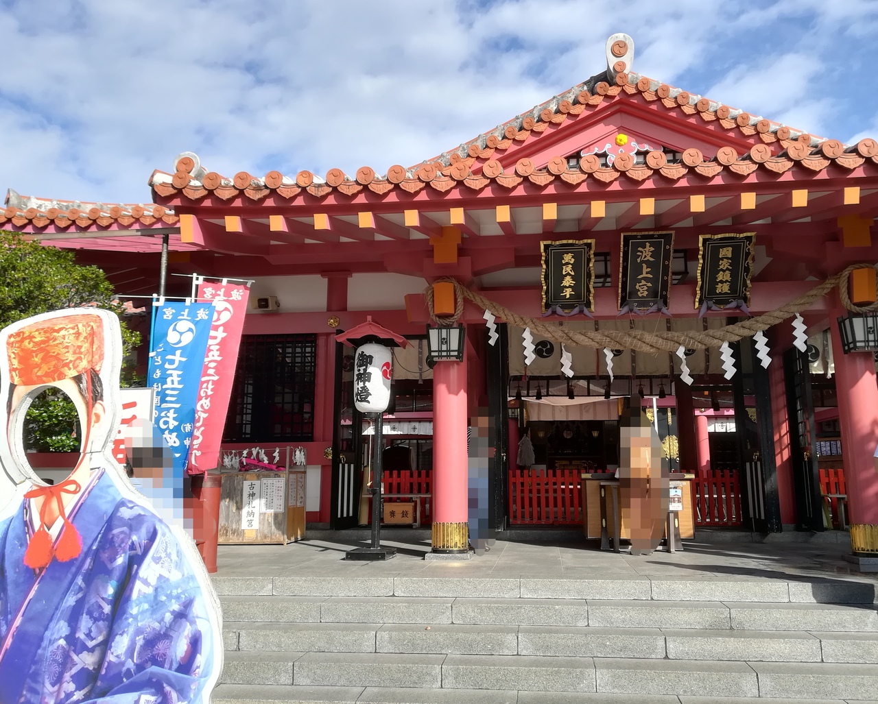 旭橋駅から向かいましたが、道を間違えてしまいかなり歩きました。この時期なので入口には「七五三おめでとう」の幟が出ていました。可愛い子供達でもいれば嬉しかったのですが、この時はおりませんでした。明るい境内で心を込めて参拝しました。横の階段を使えば波の上ビーチへと続いていますのでよかったら足を伸ばしてみませんか。