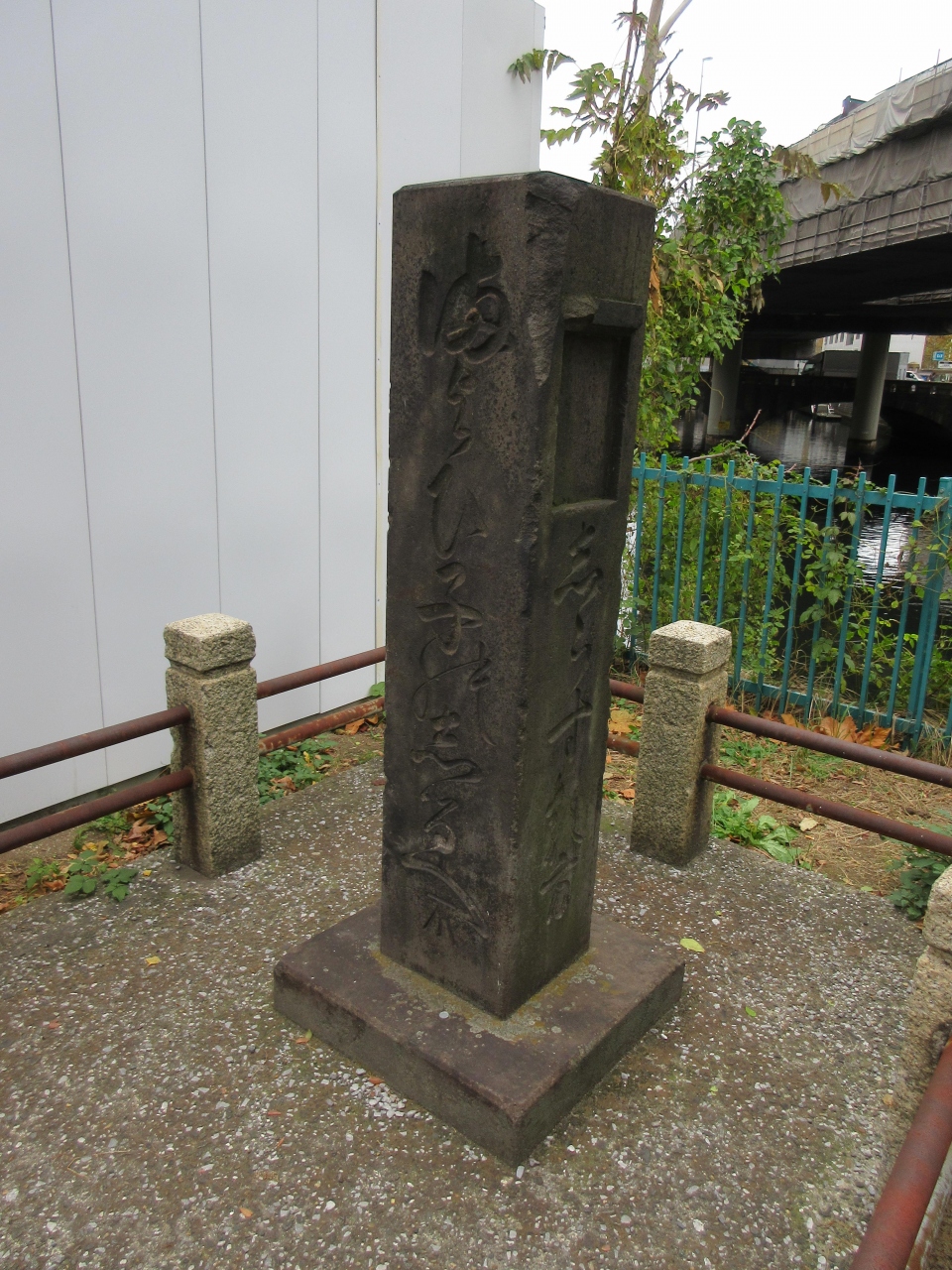 JR東京駅日本橋口から300mほど、日本橋川に架かる一石橋の親柱横に残っています。175㎝ほどの石碑で、1857年に建てられました。碑の正面には満よひ子の志るべと刻まれています。左側にはたづぬる方と、右側には志らす類方と刻まれています。迷子や尋ね人がいる場合、左の窪みに特徴を書いた紙を張り、心当たりがある場合は右の窪みに紙を張るというものです。いかに日本橋から一力橋にかけて賑やかな場所であったかがわかる石碑です。同じような石碑を浅草寺や湯島天神で見かけ興味を持ちましたが、あれらは当時のものではなかったようです。外国人のガイドさんに連れられた外国人のツアー客が、石碑の説明を熱心に聞いていたのが印象的でした。