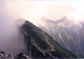 白馬鑓を下り、Ⅰ峰を巻いて、Ⅱ峰直下の信州側を進みます。進行方向左手は急峻な崖のはずですが、ガスっていて高度は確認できません。鎖場経由で岩場を超えⅡ峰稜線に辿り着くと、さらに濃いガスが上昇してきて数十メートル先の景色も見えません。Ⅲ峰の存在は確認できないまま、唐松岳へ。一本道で無事に頂上山荘へ到着でした。