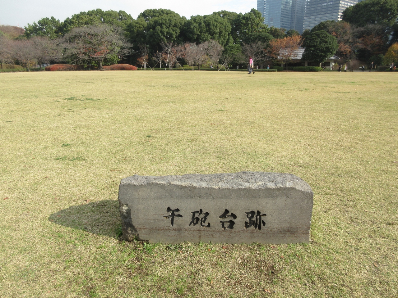 12月上旬皇居東御苑を散策した際見ました。芝生の中にあるとのことで天守台前の大奥跡を探したのですが見つからず、護衛官に聞いたら場所を教えてくれました。茶畑前の本丸大芝生内にありました。長さ80cmくらいの石に午砲台跡と彫ってありました。説明がないのでどのような砲台があったのか分からず後で調べると、報時の空砲を撃った砲台があった場所で砲台は江戸東京たてもの園にあります。昭和初期に経費節減のため午砲はサイレンに替わったようです。高台にあるから音はどのくらい遠くまで聞こえたのか興味あります。石碑を置いてあるのならちょっとした説明板があってもいいなと思いました。皇居東御苑パンフレットに載っていないので気づかれないのが惜しいです。