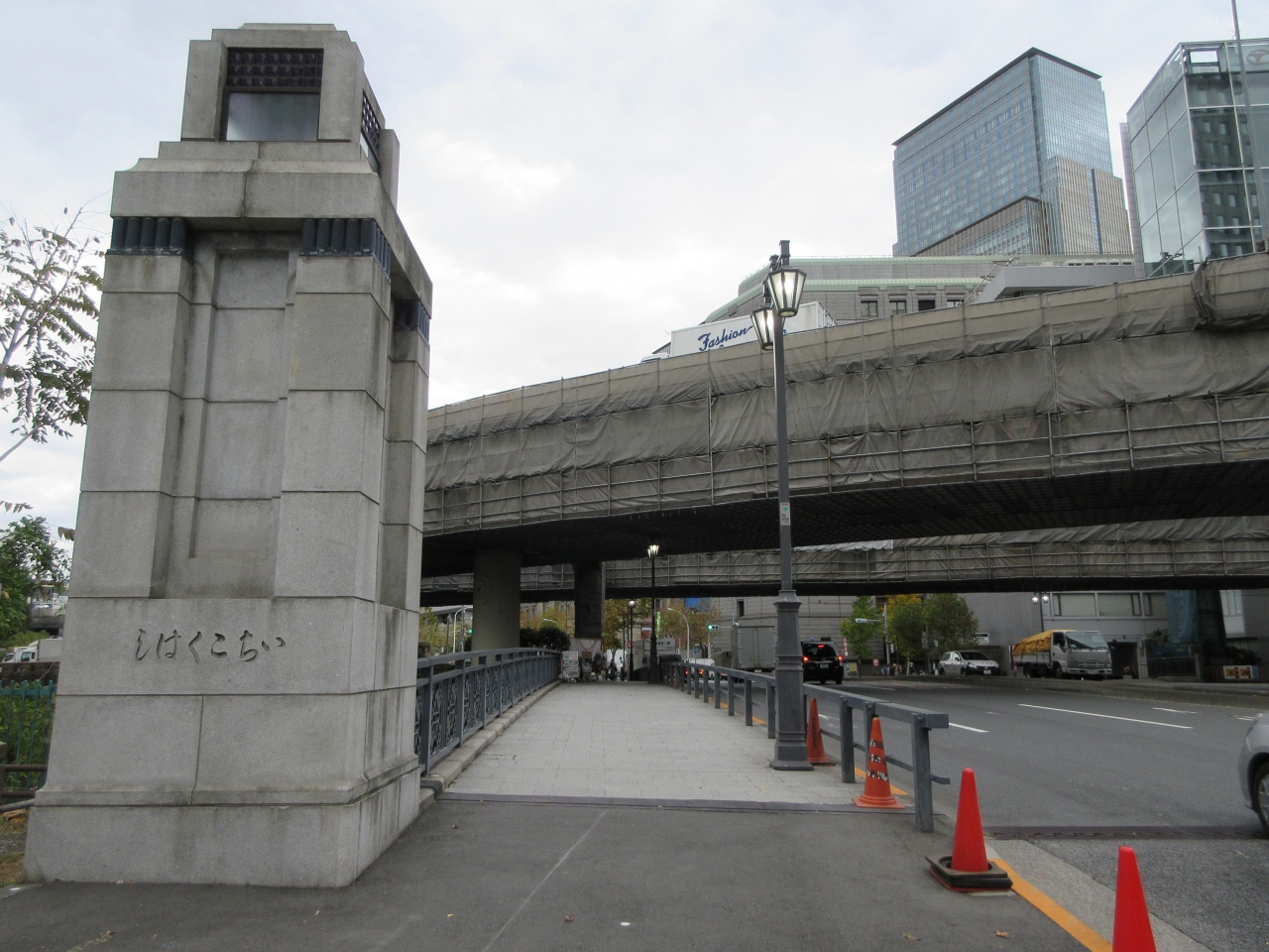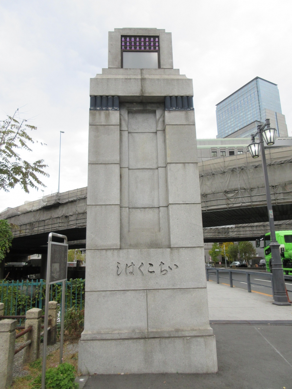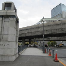 日本橋川に架かる橋で江戸初期から木橋が架かっていました。1922年に鉄筋コンクリートの橋が架けられ、関東大震災後も使われてきました。1997年に現在の橋に架け替えられ、大きな親柱の1基が残され当時の花崗岩張りの橋の名残を伝えています。大正時代の親柱の上部に紫色の四角いガラスがはめ込まれていて見る角度により紫色にほんのり光って見えるのが印象的です。平日午前に訪れた時、車の交通量は多く、人の通りは少なかったです。高速道路の下あたりにホームレスがいました。欄干や街灯は灰色ですっきりとしたデザインでした。大正時代の堂々とした親柱を見るだけでも価値があると思います。