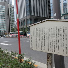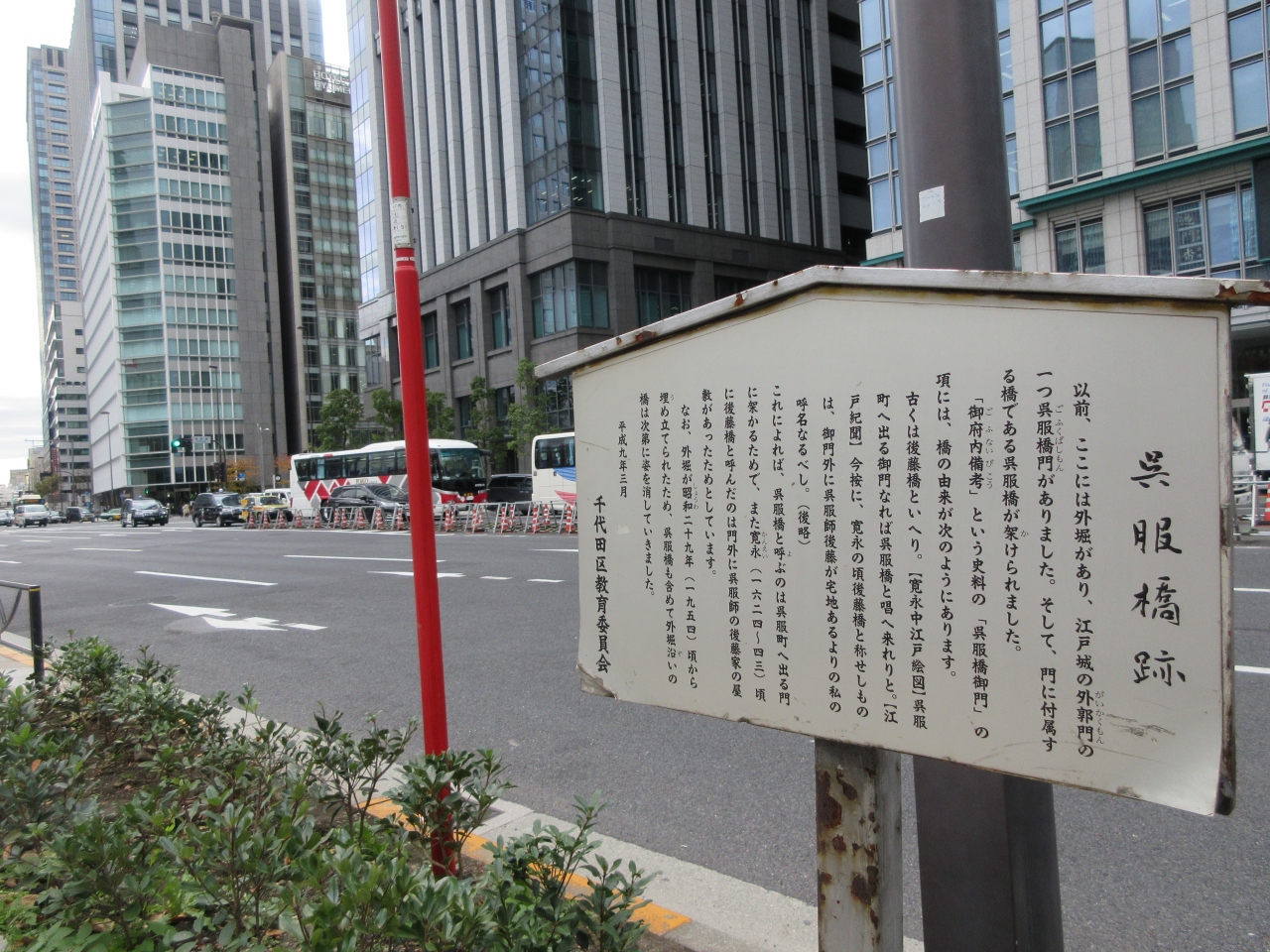 東京駅日本橋口から2分ほど歩いたところの永代通りの歩道に説明板が立っています。この辺りに江戸城の外堀があり、呉服橋が架かっていて外郭門である呉服橋門があったことが記されています。呉服物の幕府御用達商人の後藤家屋敷があったことから名づけられたらしいです。違和感なく呉服橋と言ってきましたが、御用達商人から来ていると初めて知りました。今は東京駅入口の一つで観光バスや車の往来が激しい場所です。江戸城から近い場所だったことから呉服商が重要な商売だったことも分かります。